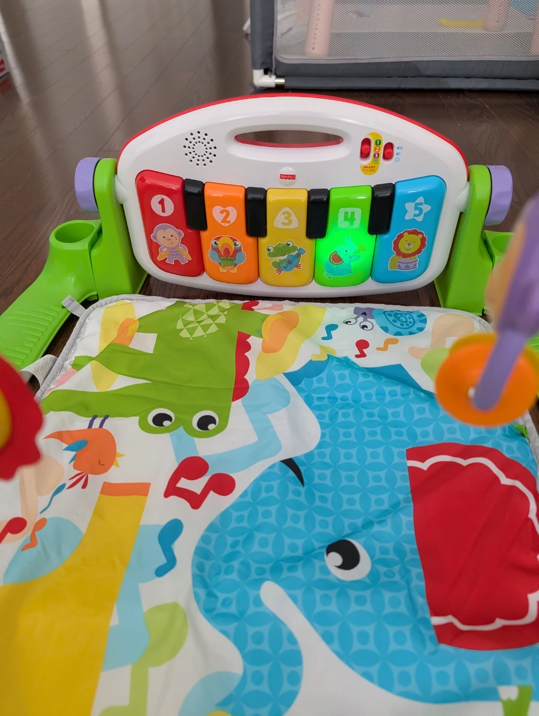 This Fisher-Price Deluxe Kick & Play Piano Gym features 4 ways to play and includes over 65 songs, sounds, tunes & phrases. It has activity toys, including a take-along piano. Learning content grows with baby, teaching animals, sounds, colours, shapes, and numbers. Working well, batteries are not included.