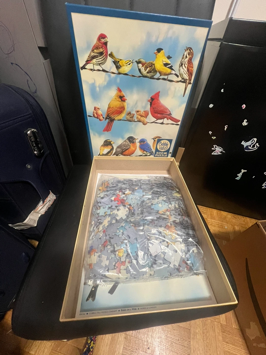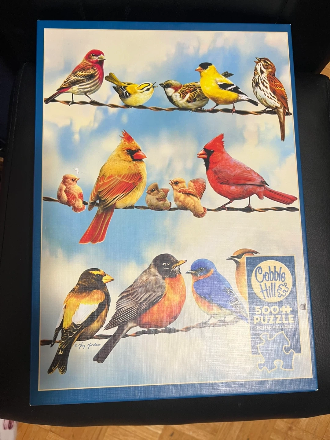 This is a Cobble Hill 500-piece jigsaw puzzle titled "Birds on a Wire". It features a colourful illustration of various birds perched on wires. The puzzle is in excellent condition. It's great for bird enthusiasts or puzzle lovers!