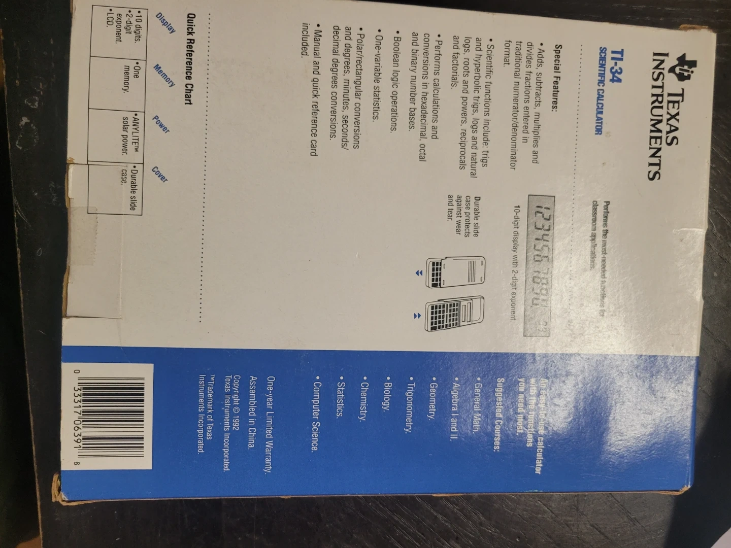 This is a New TI-34 Scientific Calculator is great for algebra, trigonometry, and computer science. It features ANYLITE solar power. Includes manual and quick reference card. Ideal for students needing a reliable calculator for advanced math.