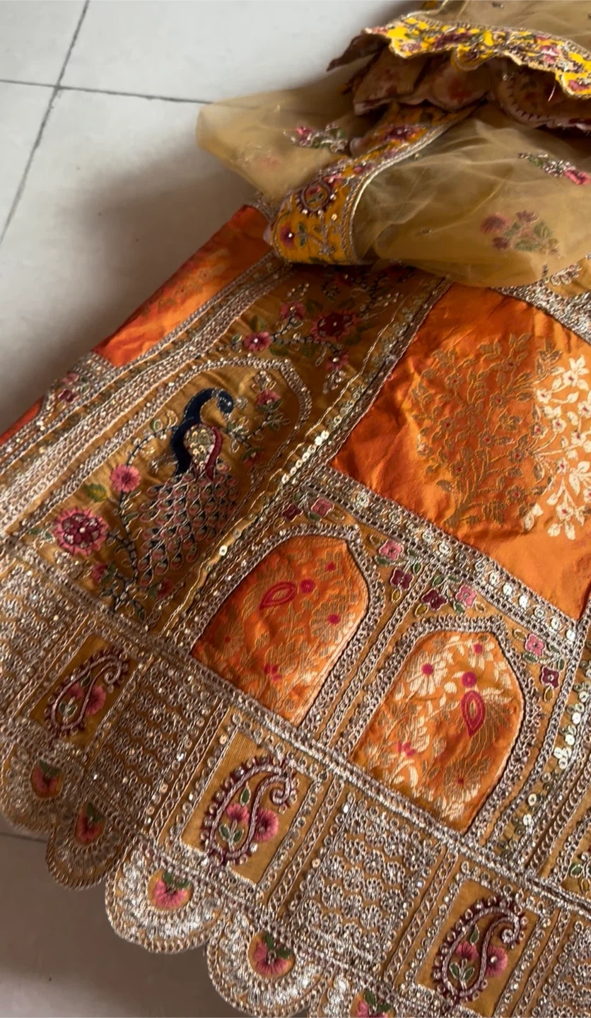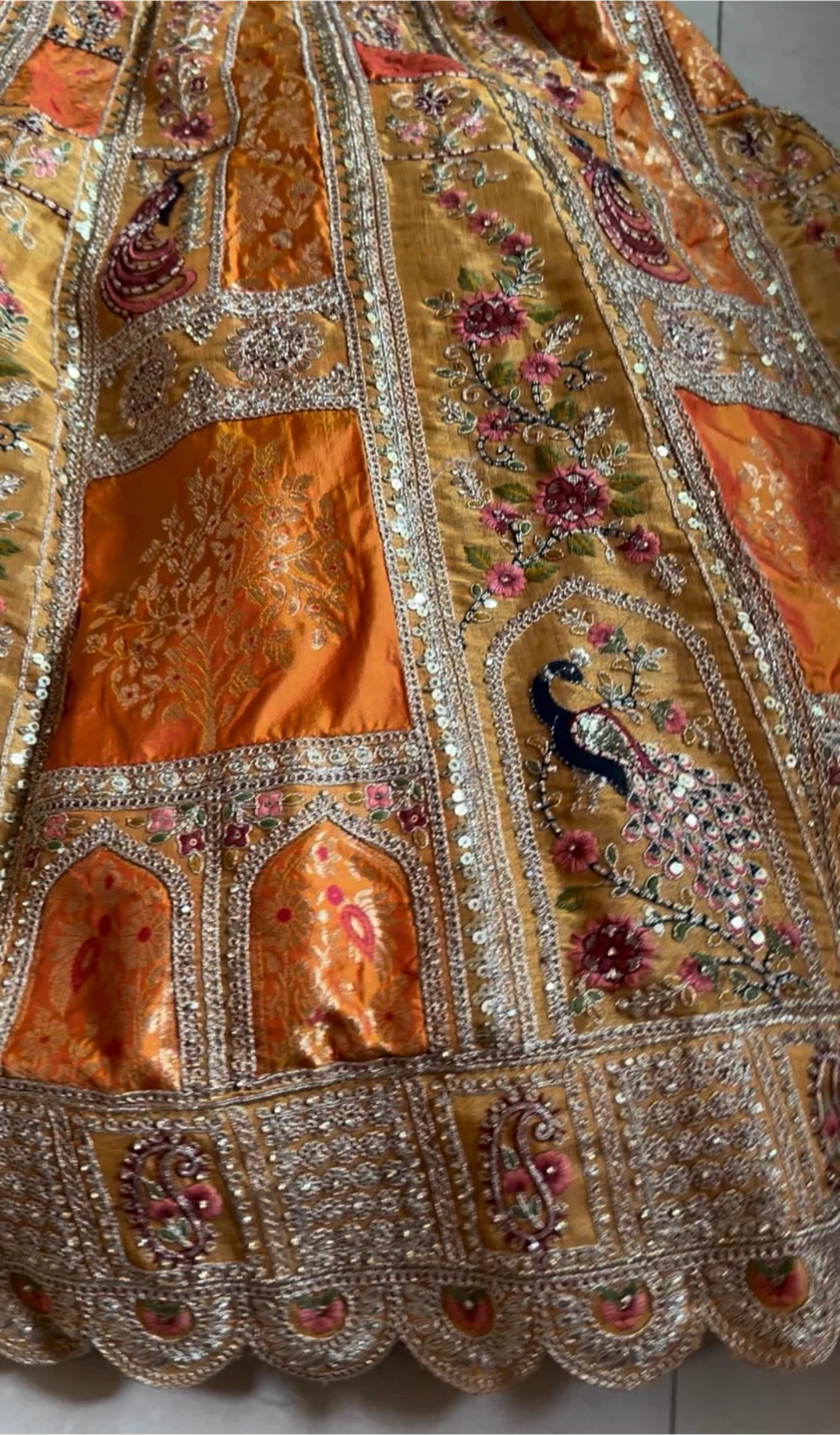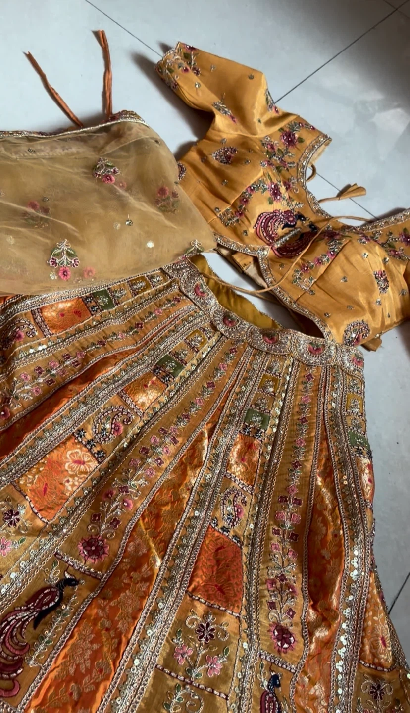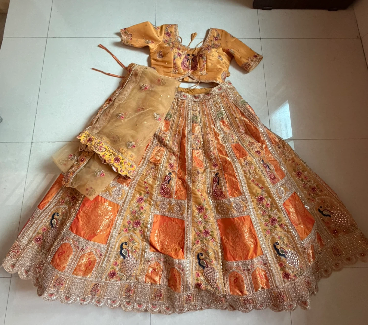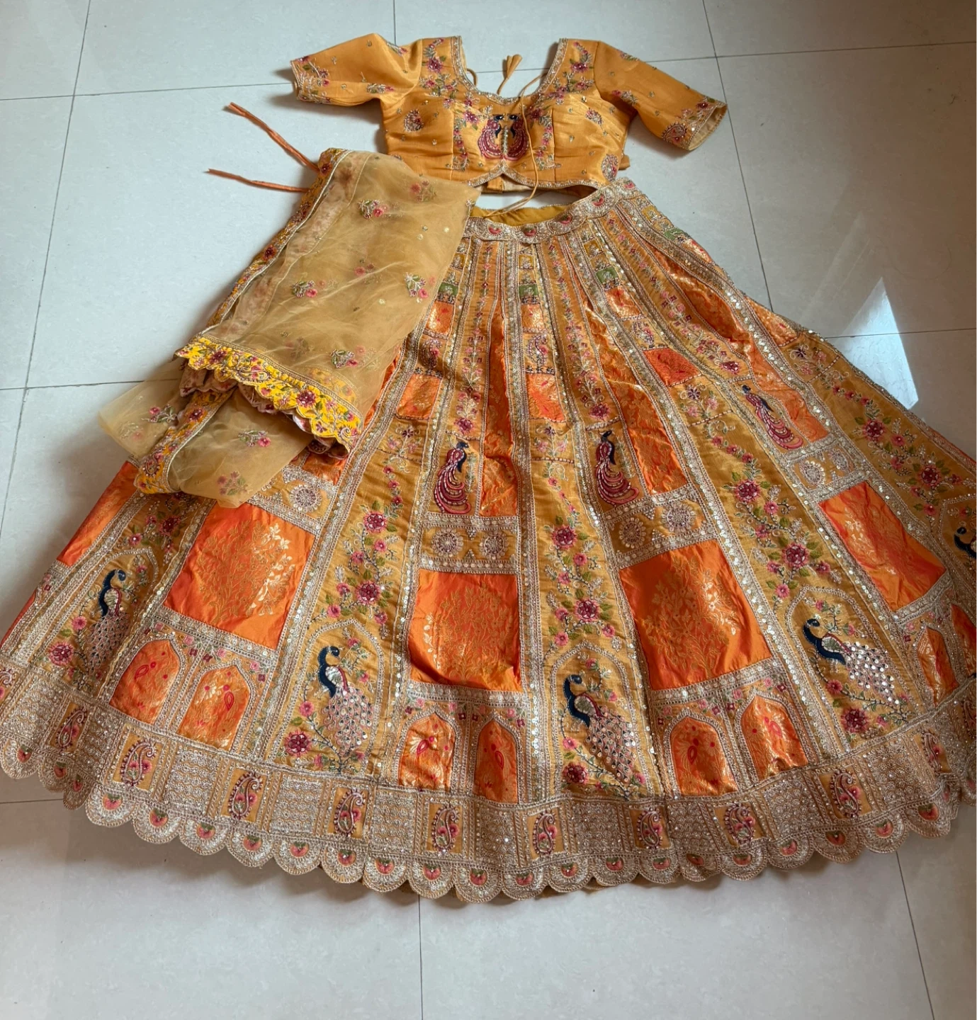This is a beautiful embroidered lehenga choli set with a matching dupatta. It features intricate peacock and floral designs with sequin embellishments. The set is made of silk and net fabric, perfect for special occasions.