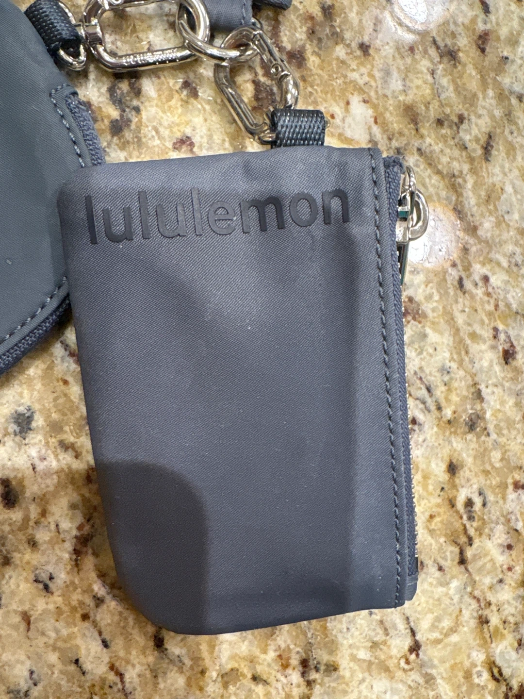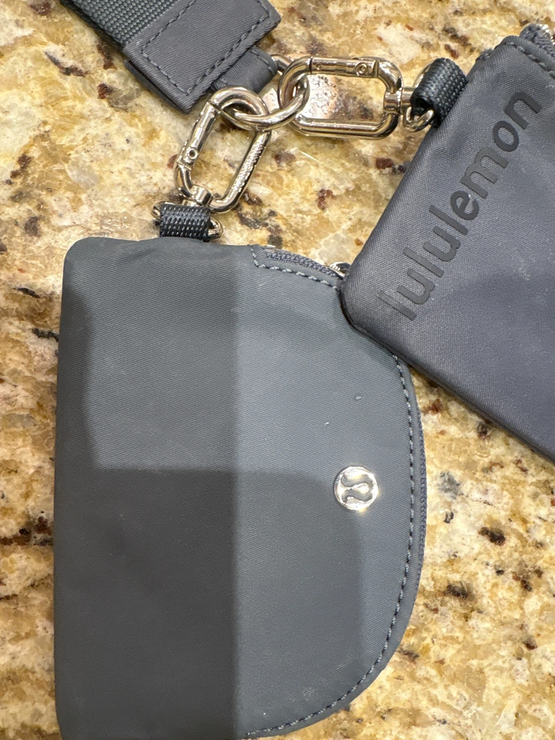 Lululemon grey multi pouch set. Includes a larger curved pouch and a smaller zippered pouch, attached by a strap and carabiner. These pouches are made of durable fabric.