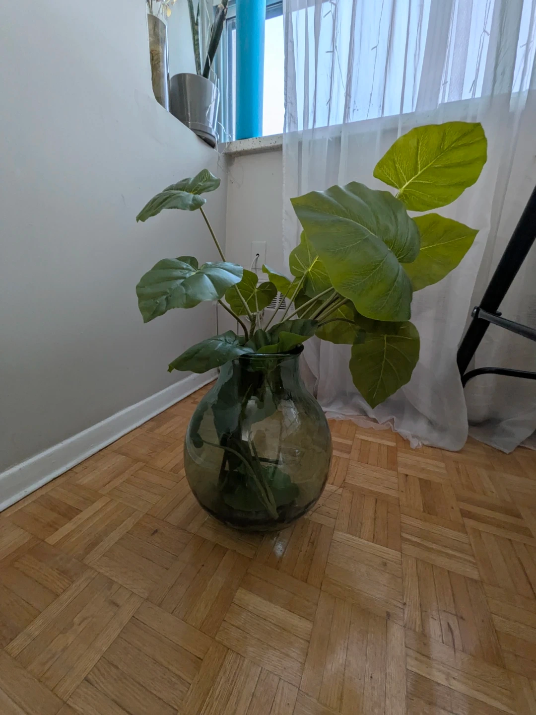 Artificial plant with large green leaves presented in a tinted glass vase. It's a nice decorative piece for any room. Vase is a smoky grey colour.