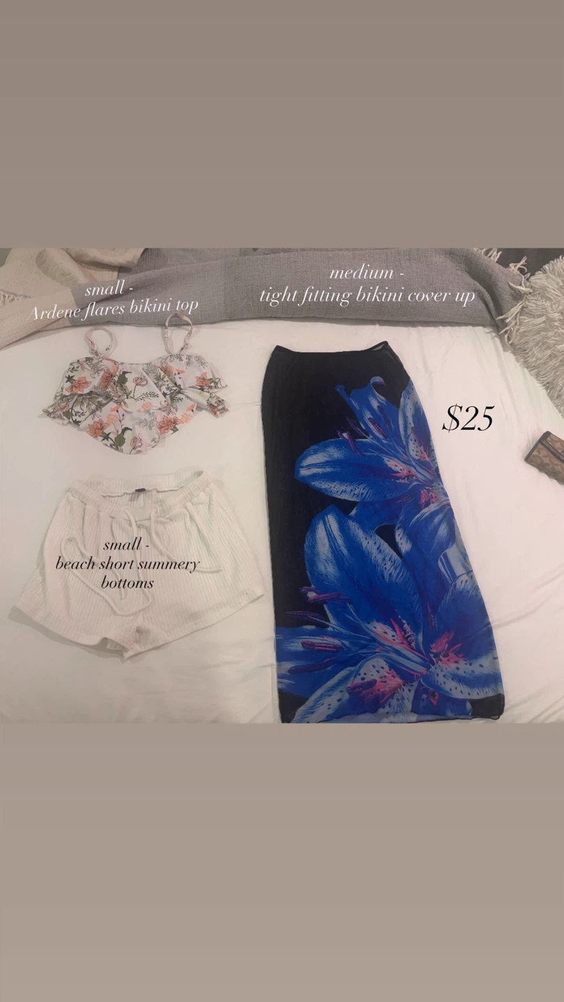 This is a small Ardene flares bikini top and a medium tight fitting bikini cover up. The beach short summery bottoms are also size small. Perfect for your next beach vacation!