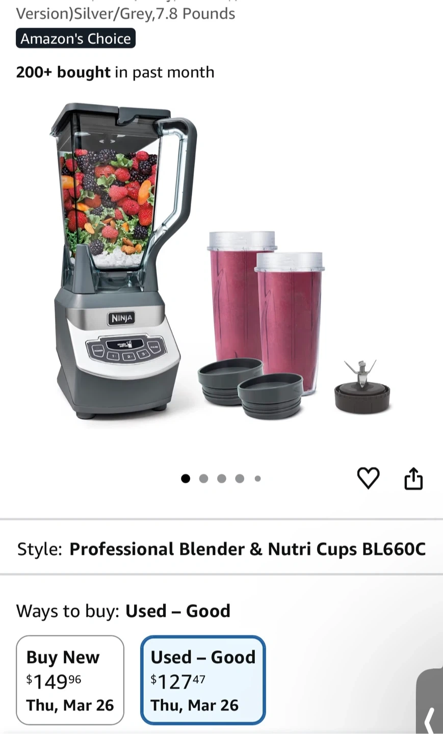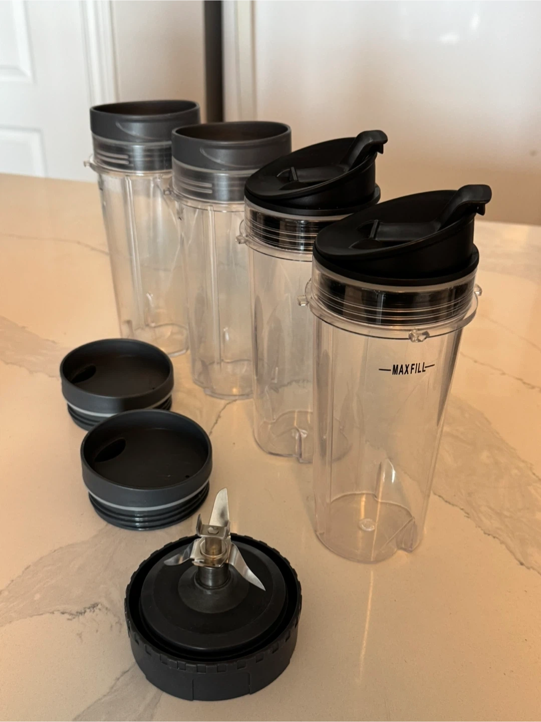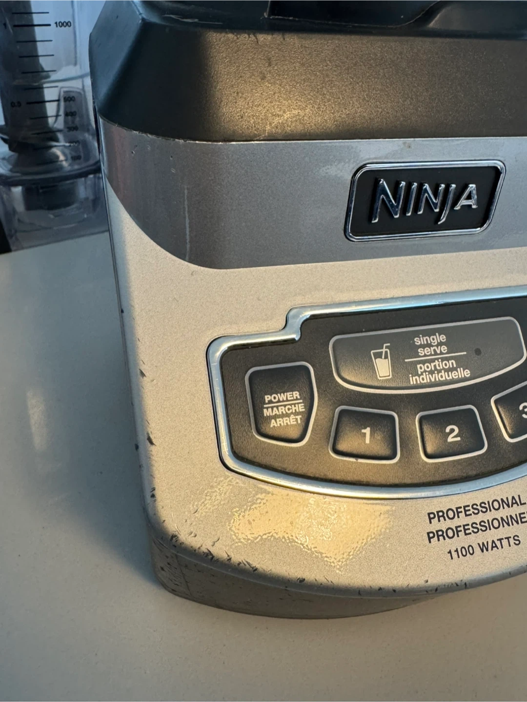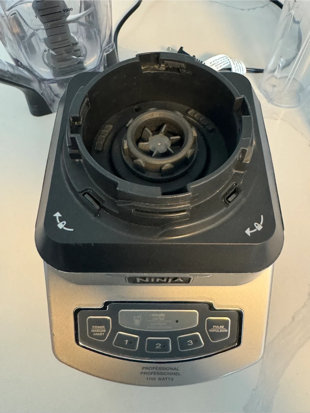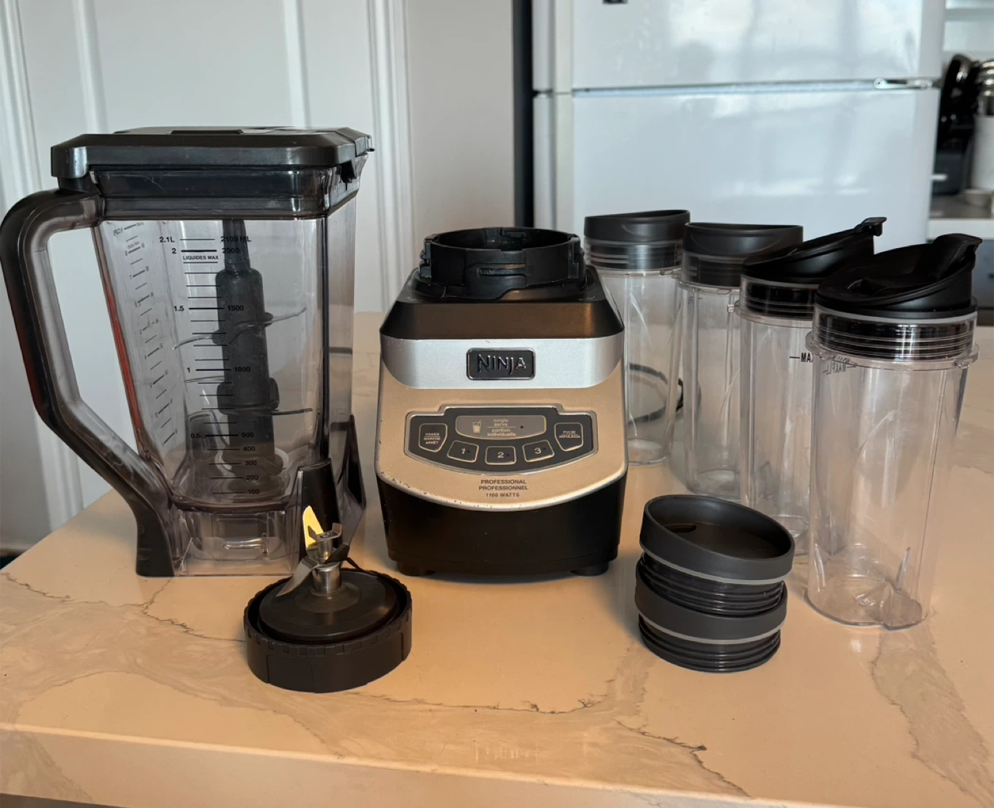 Ninja Professional blender with a 2.1L pitcher and 4 single-serve cups. It has 1100 watts of power for blending. Ideal for making smoothies and other blended drinks.
