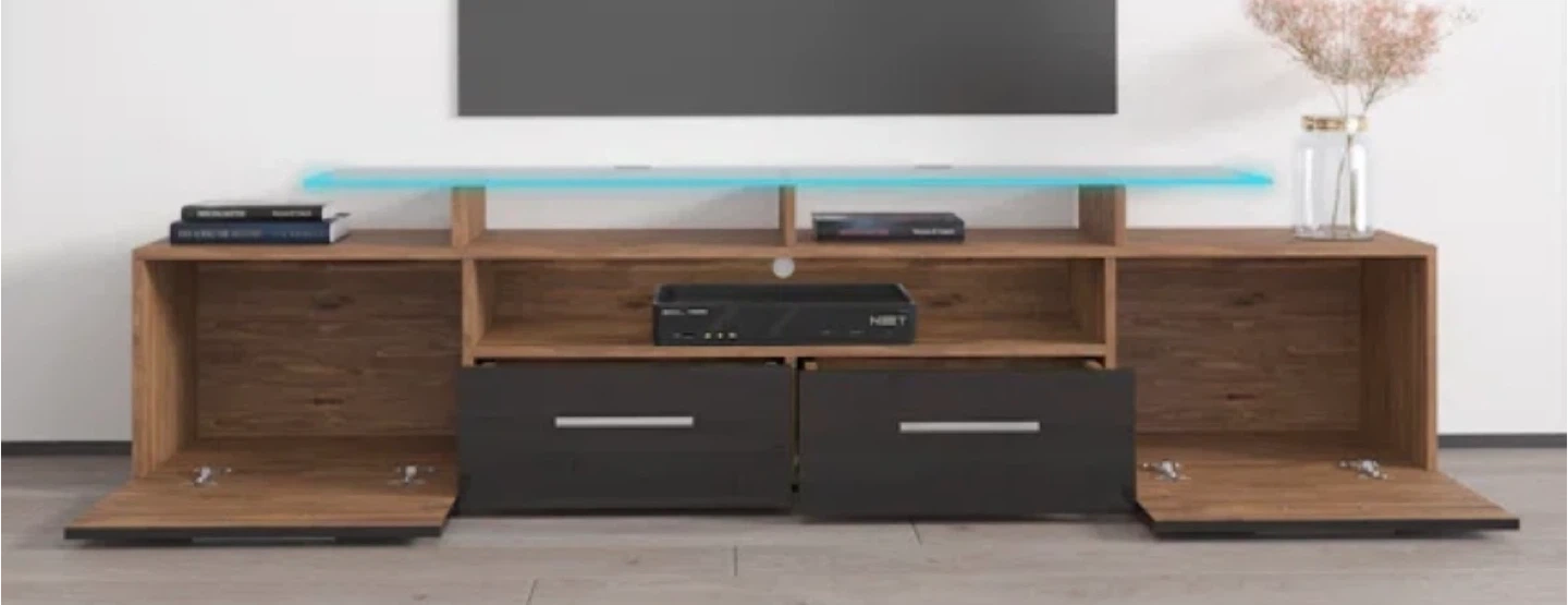 Selling a modern TV stand/media console. It features a sleek design with a combination of dark and wood-tone finishes. The unit has multiple drawers and open shelving for storage and display. It's perfect for organizing your media equipment and accessories while adding a stylish touch to your living room