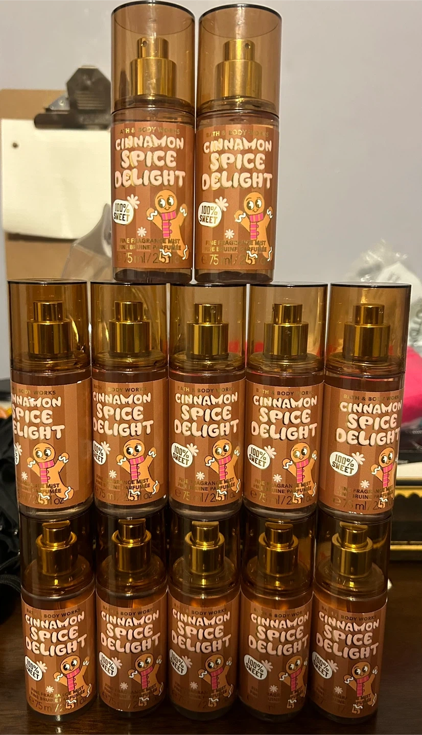 Twelve 75ml bottles of Bath & Body Works Cinnamon Spice Delight fine fragrance mist. It's a sweet, warm scent. Great for a personal fragrance refresh or to share!