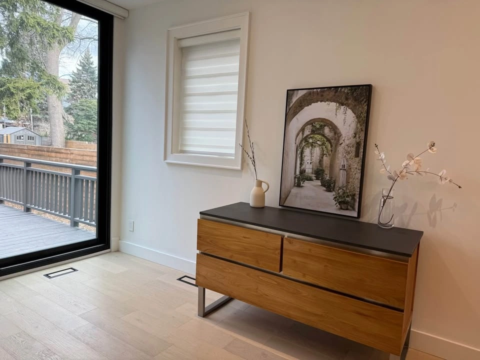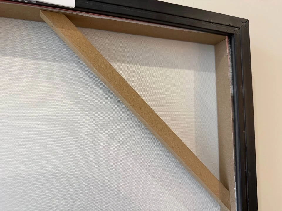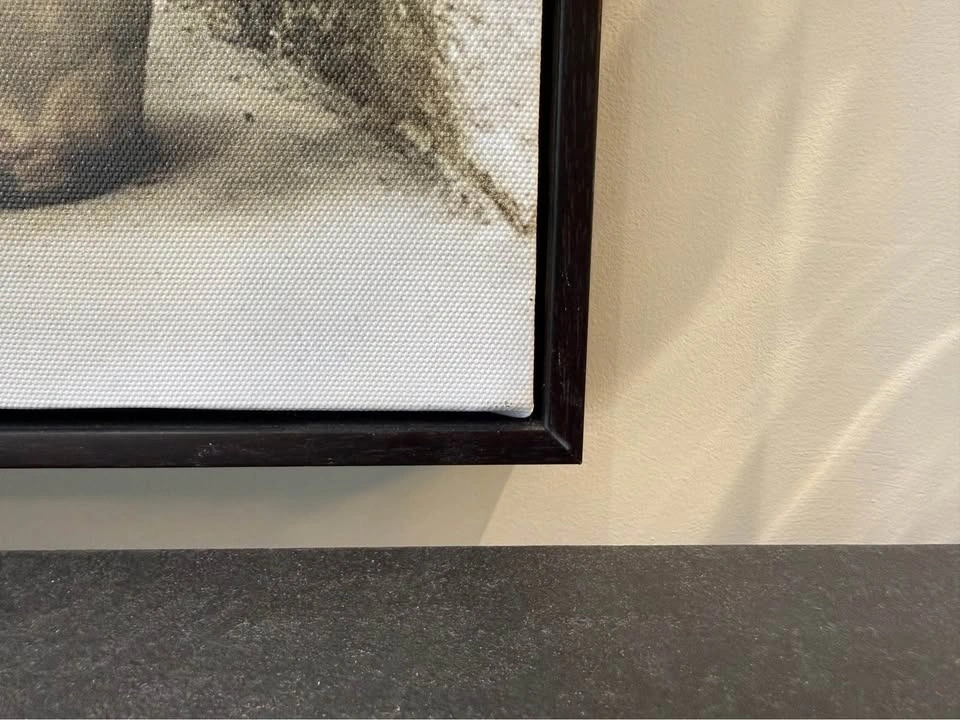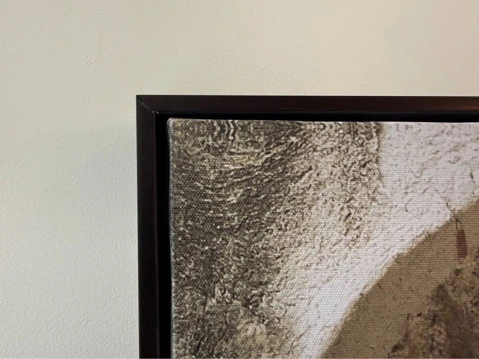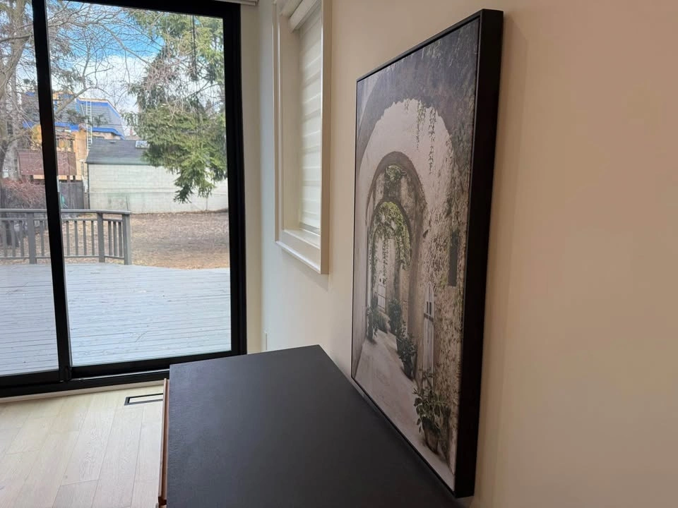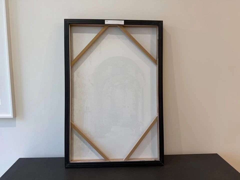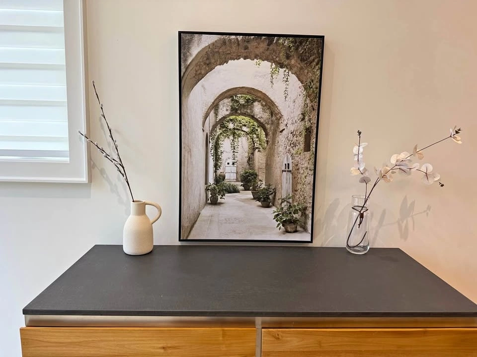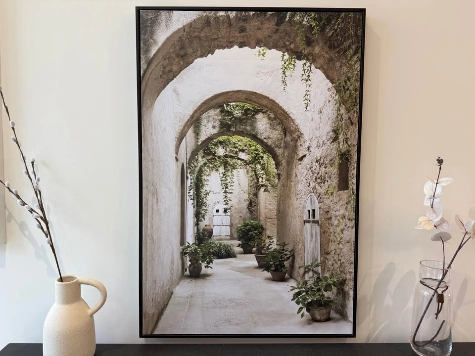 Beautiful framed canvas art print with a scene of an arched pathway and lots of greenery. The black frame is sleek. Great for adding some charm to your space. Dimensions: 25” W x 37” H x 1.5”D.