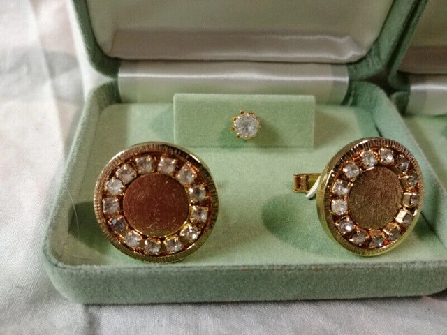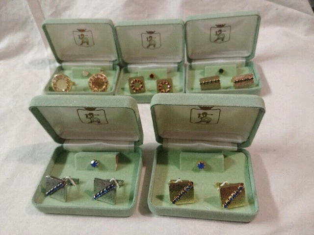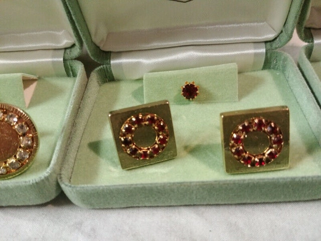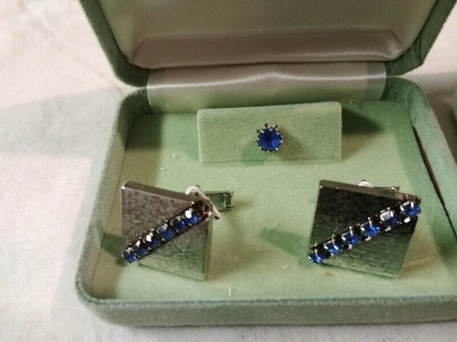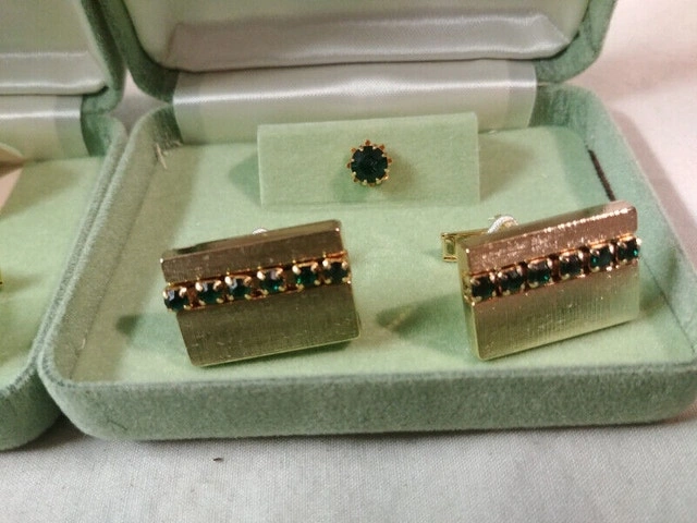 Up for sale we have 5 New Vintage set of Cufflink and Tie Pin there is 2 set of Blue glass crystal 1 set is goldtone and 1 on silvertone also all 3 set in goldtone , 1 set green glass crystal one set with red glass crystal and one set with white glass crystal all in there metal cases and in new mint condition