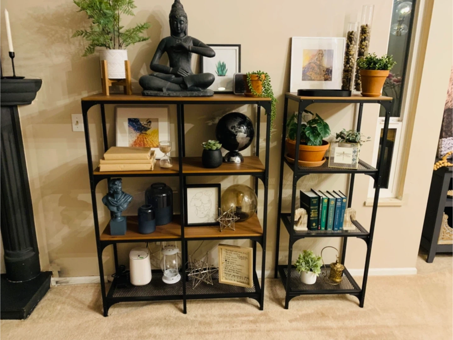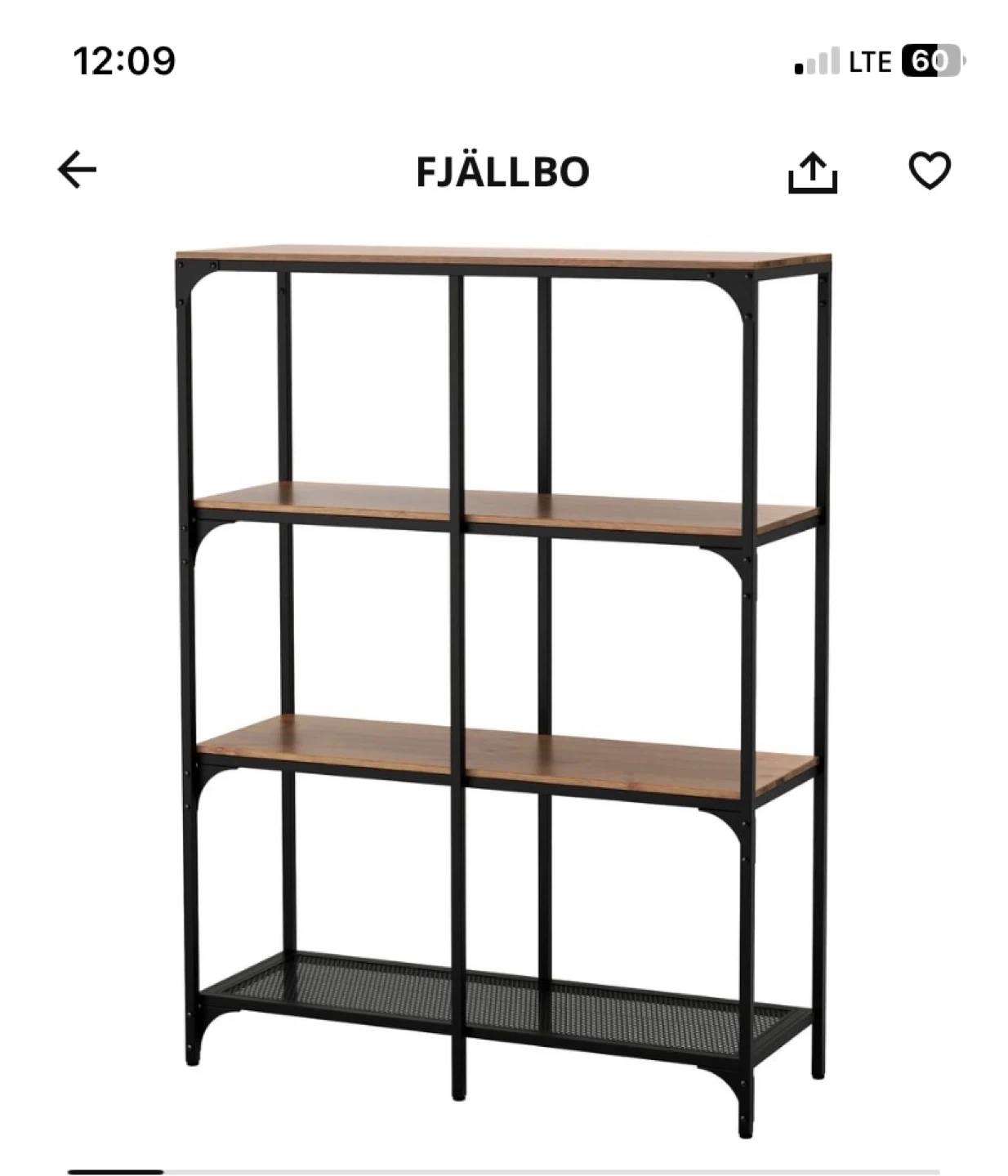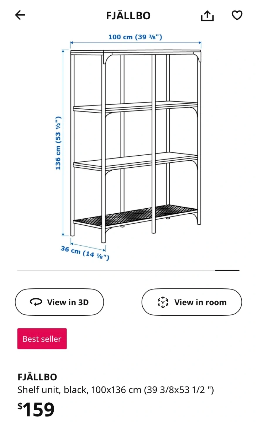 This IKEA FJÄLLBO shelf unit features a black metal frame with wooden shelves. It's 100 cm wide and 136 cm tall. Perfect for storing books and decor!