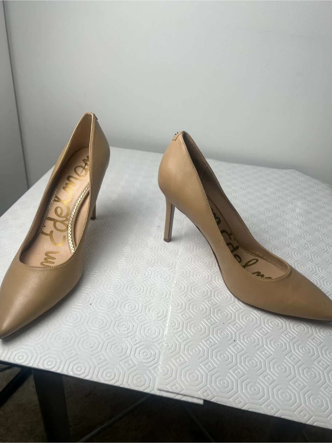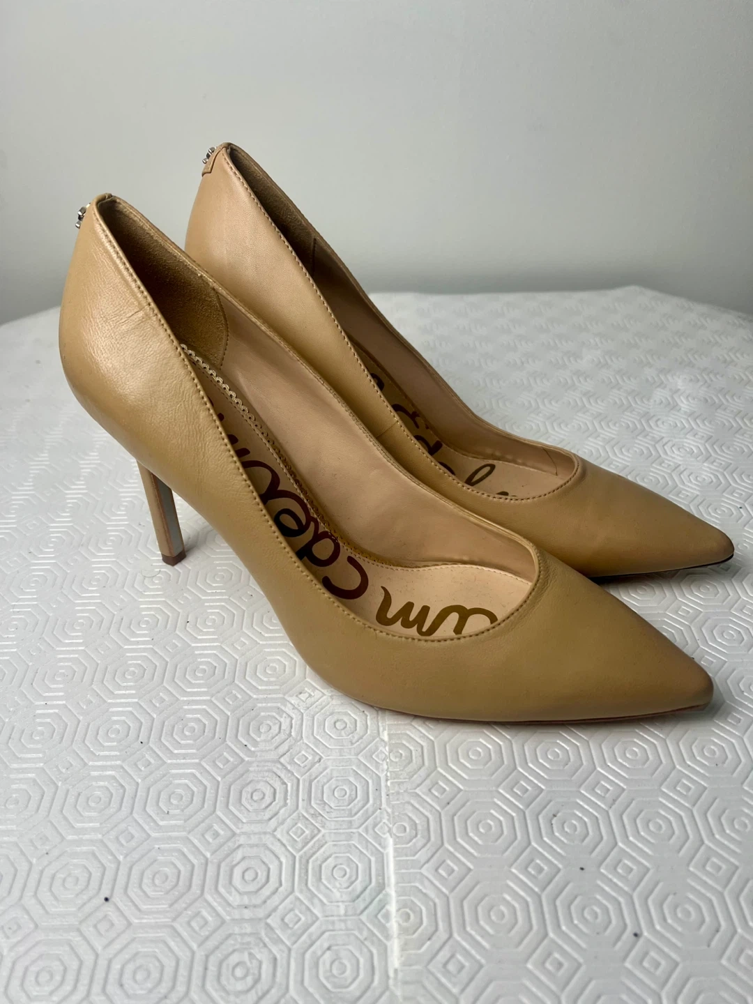 Classic tan leather pumps by Sam Edelman. These stylish heels are made from genuine leather and feature a pointed toe with a stiletto heel. They're perfect for dressing up any outfit!