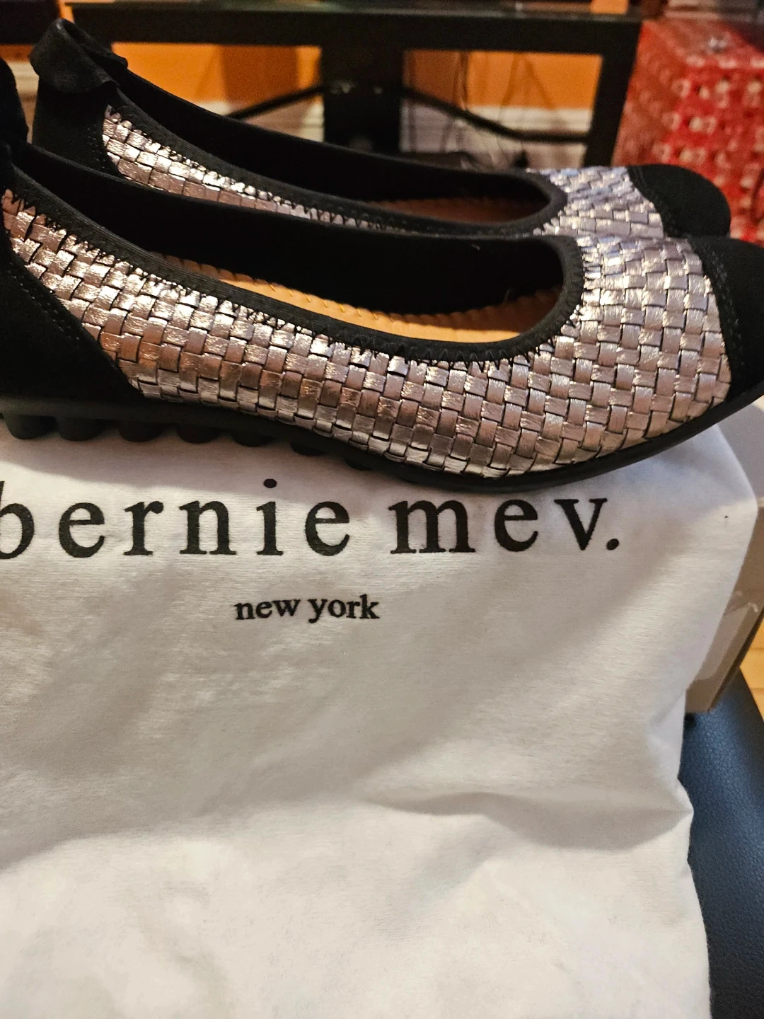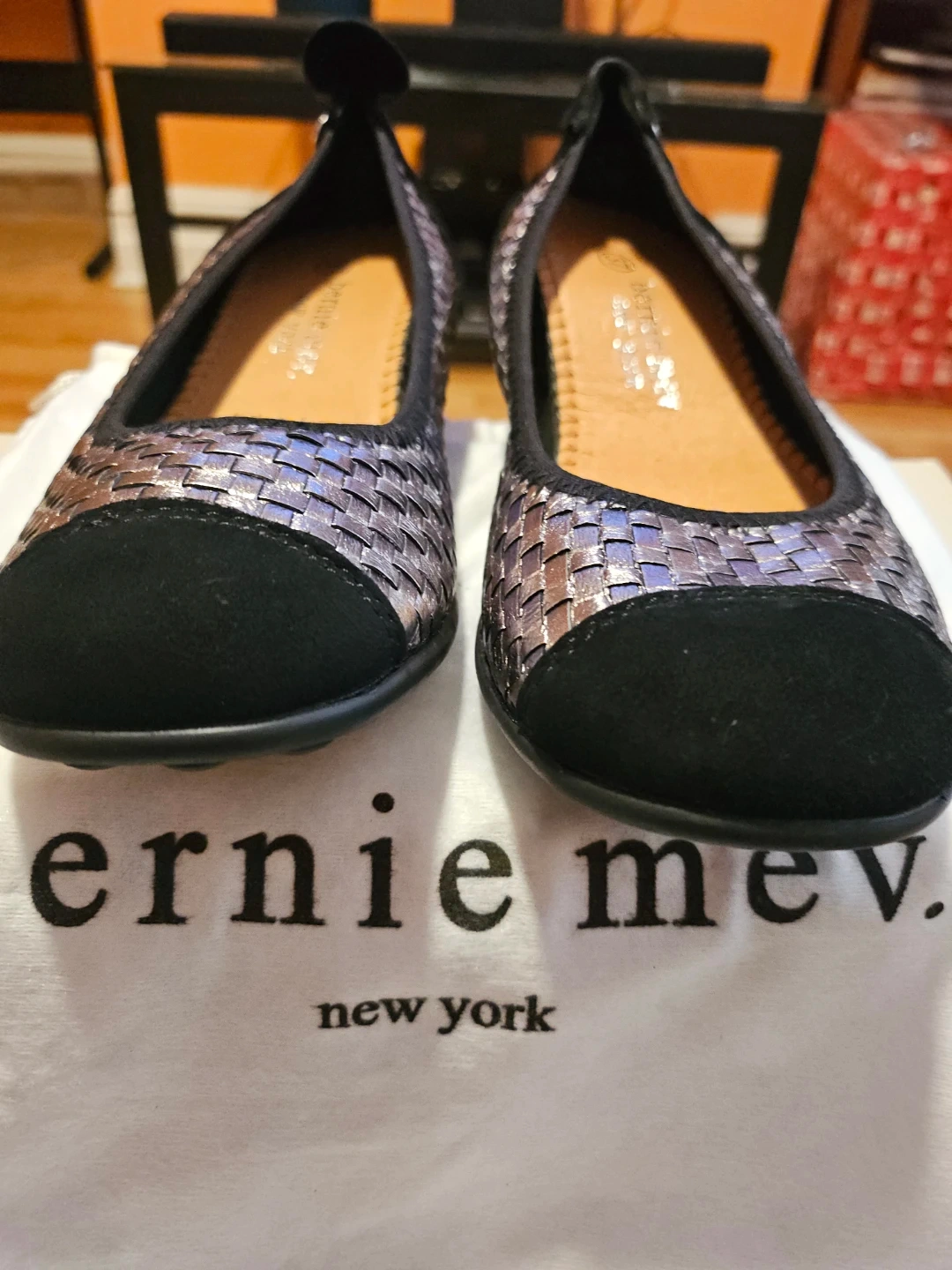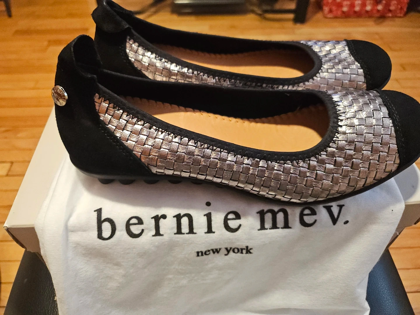Bernie Mev. New York woven ballet flats in silver and black. These slip-on shoes have a woven metallic toe box and a black suede-like cap toe and heel. Comfortable and stylish for everyday wear!