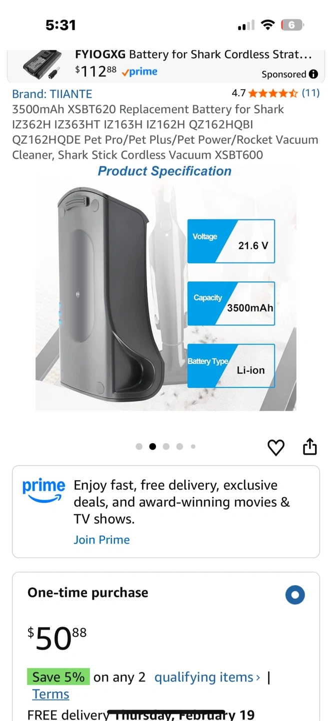 TIANTE π Li-ion Battery for Shark Cordless Vacuum XSB T600