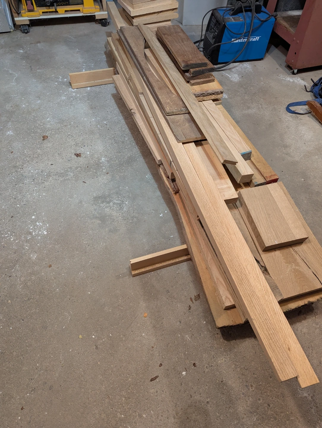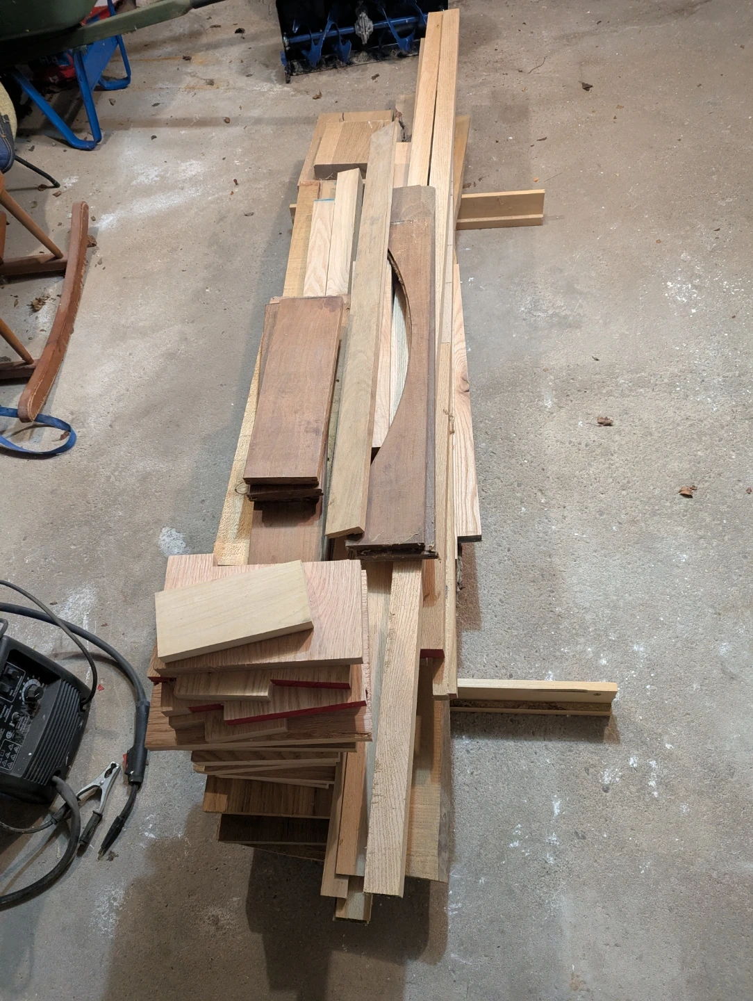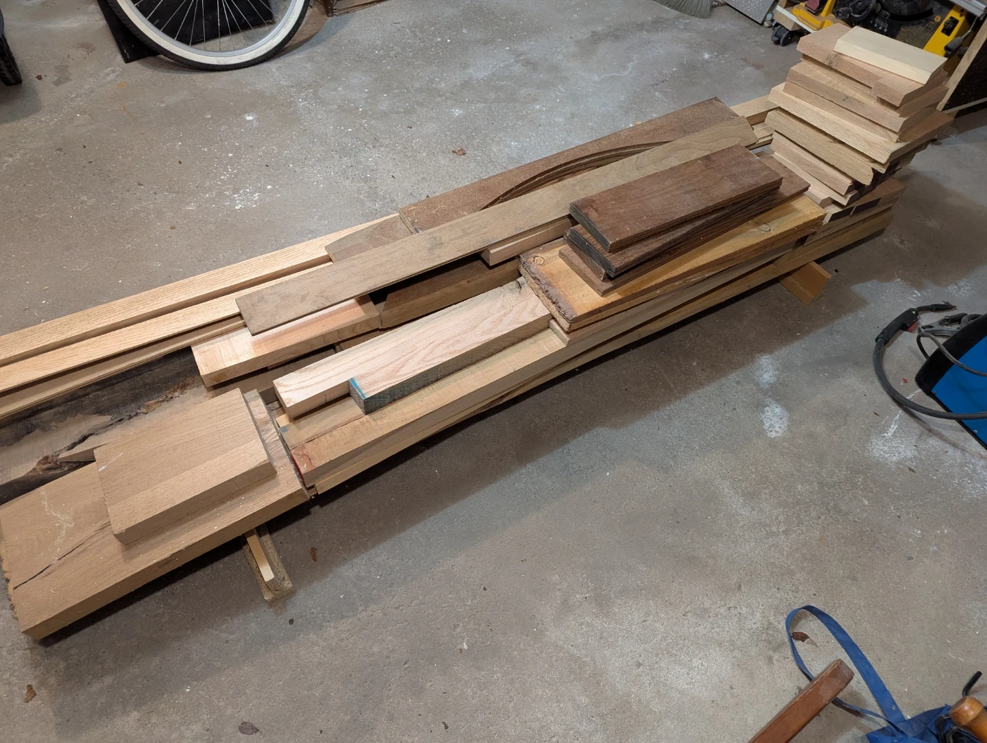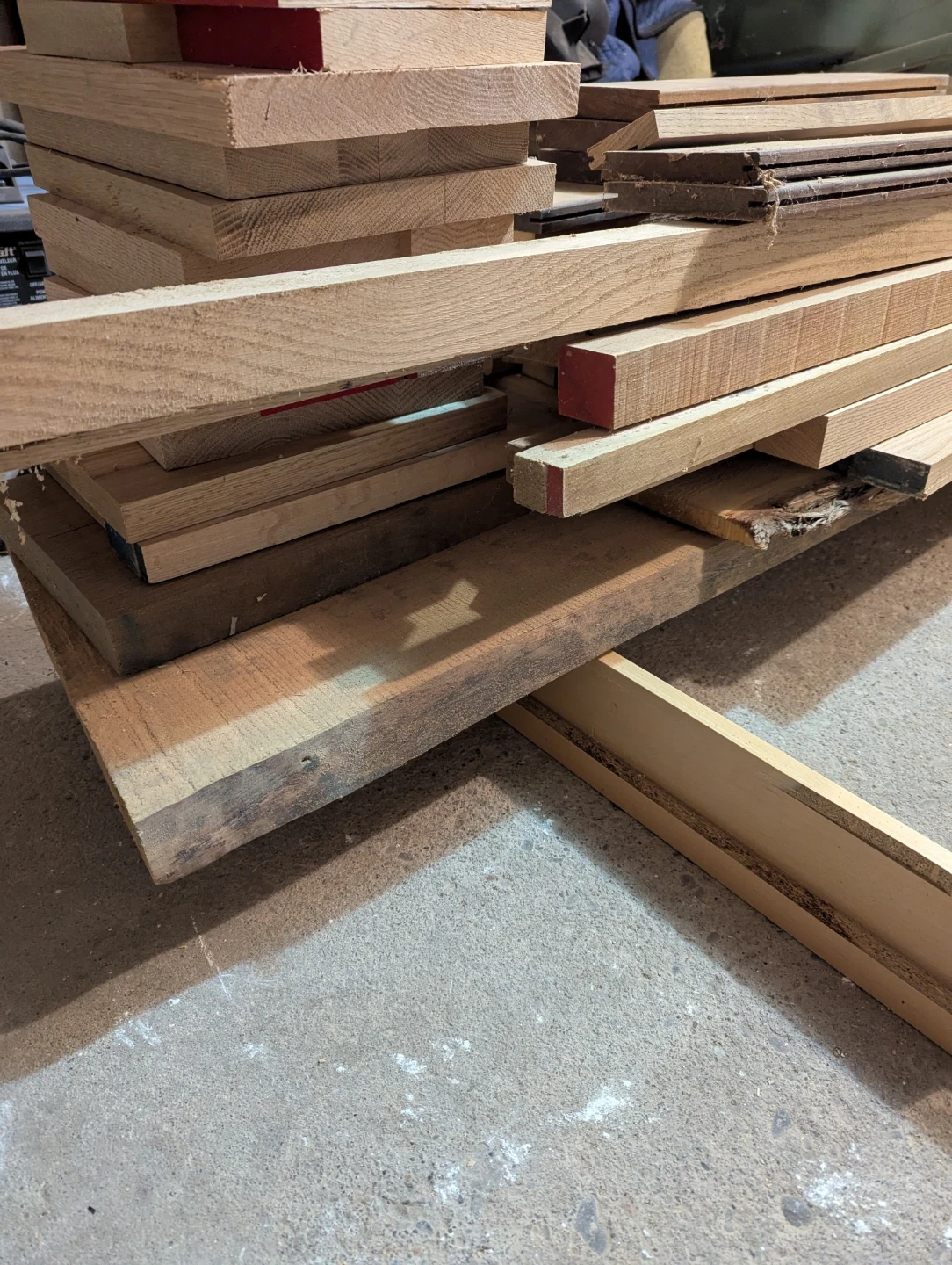 Collection of mixed hardwood lumber pieces. Great for woodworking projects or crafts! Various sizes and types of wood are included.