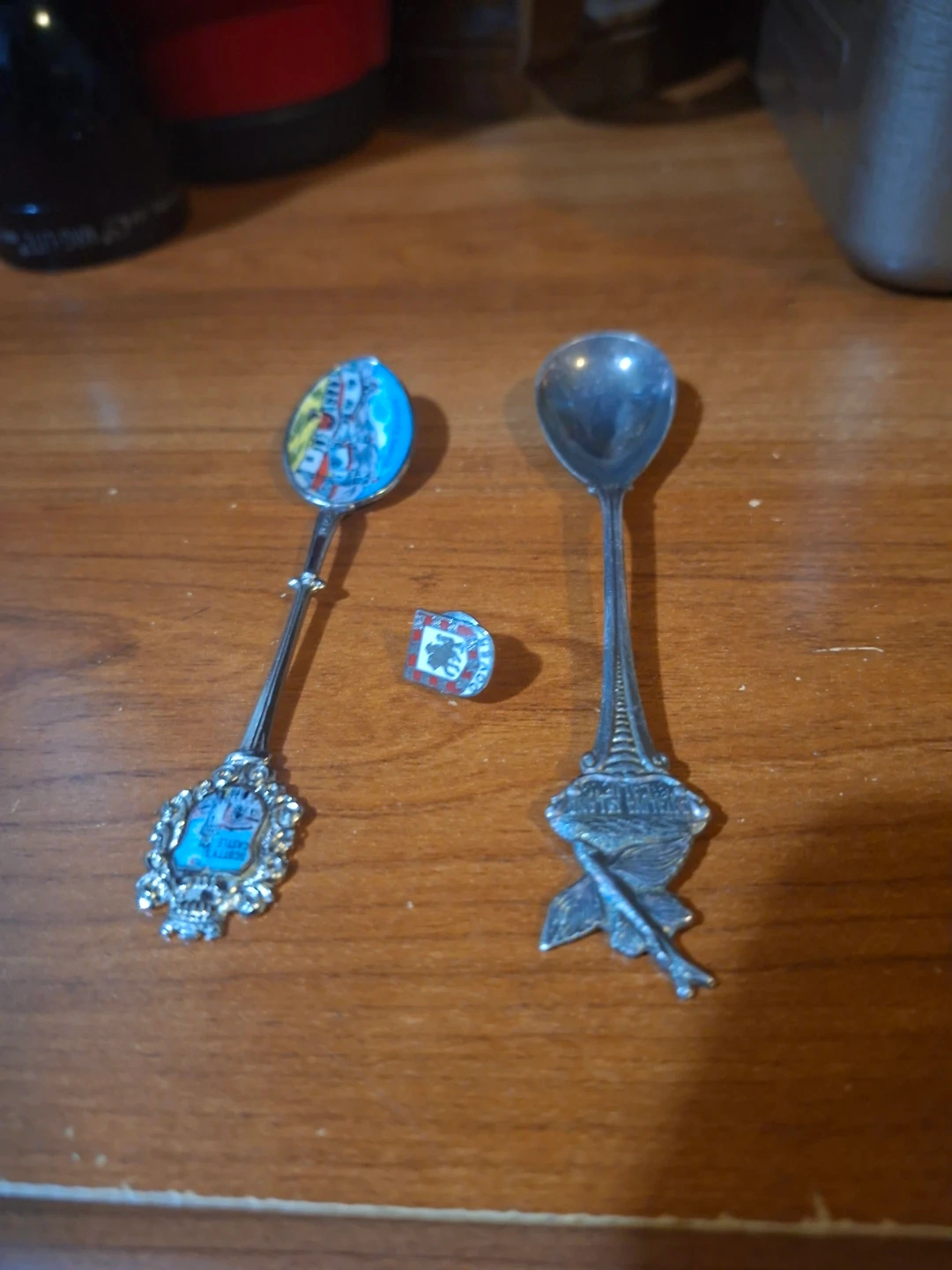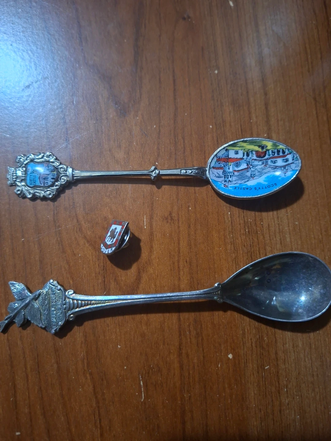 Two souvenir spoons featuring scenic designs. One spoon depicts 'Scotty's Castle' with intricate detailing on the handle. The other spoon displays a colourful architectural scene with a decorative handle. Includes a small pin with a crest.