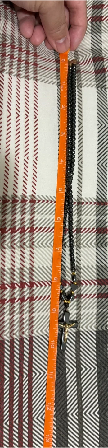This necklace features dark grey beads with gold-toned accents and a crucifix pendant. It's secured with a magnetic clasp. The beads are uniform in size. This piece would be worn by someone looking for spiritual or fashion jewellery.