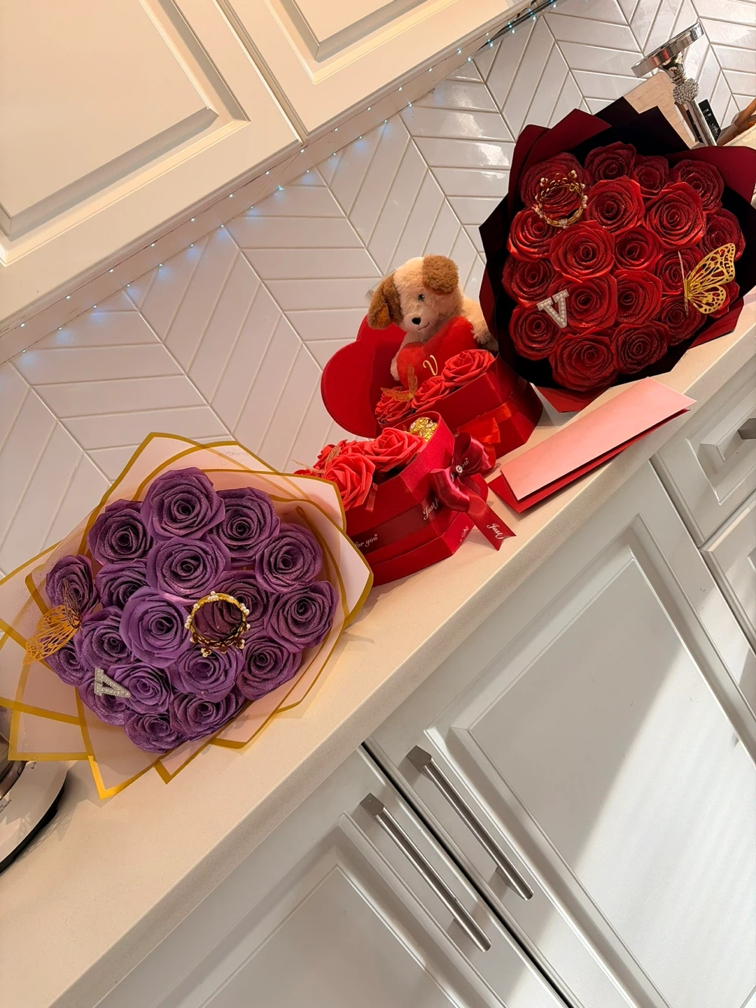 Selling these beautiful rose bouquets, perfect for birthdays or special occasions! They come decorated with a cute little crown and butterfly accents. Available in red, purple, and blue colours. They're sure to brighten up anyone's day!