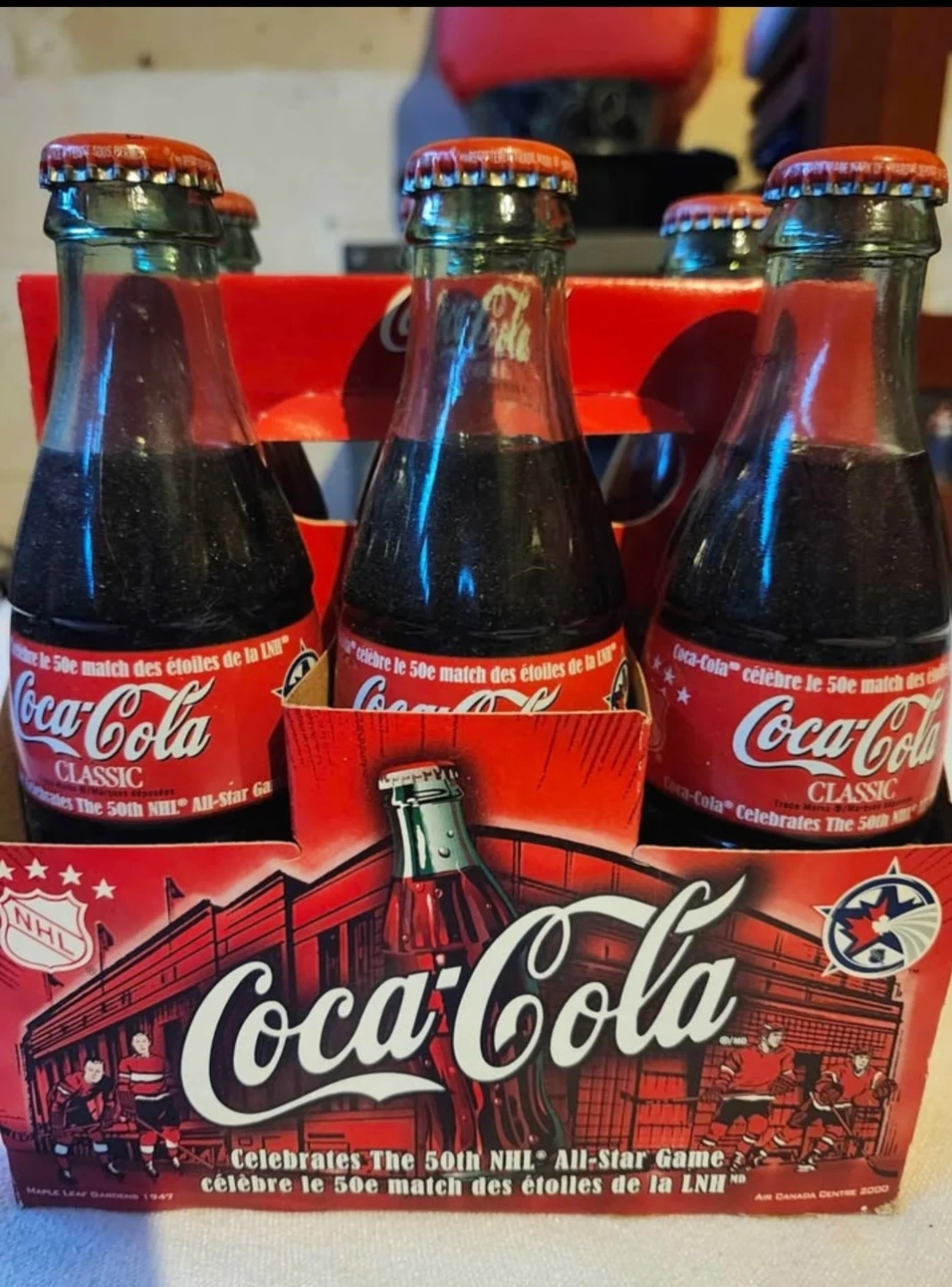Celebrate the 50th NHL All-Star Game with these mini Coca-Cola Classic bottles! This special edition set features unique labelling commemorating the event. Original glass bottles.