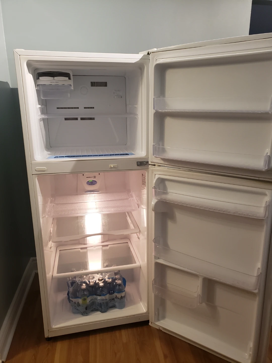 Used item - This is a white top-freezer refrigerator. It has adjustable shelves in both the fridge and freezer compartments. The door also includes multiple shelves for convenient storage.