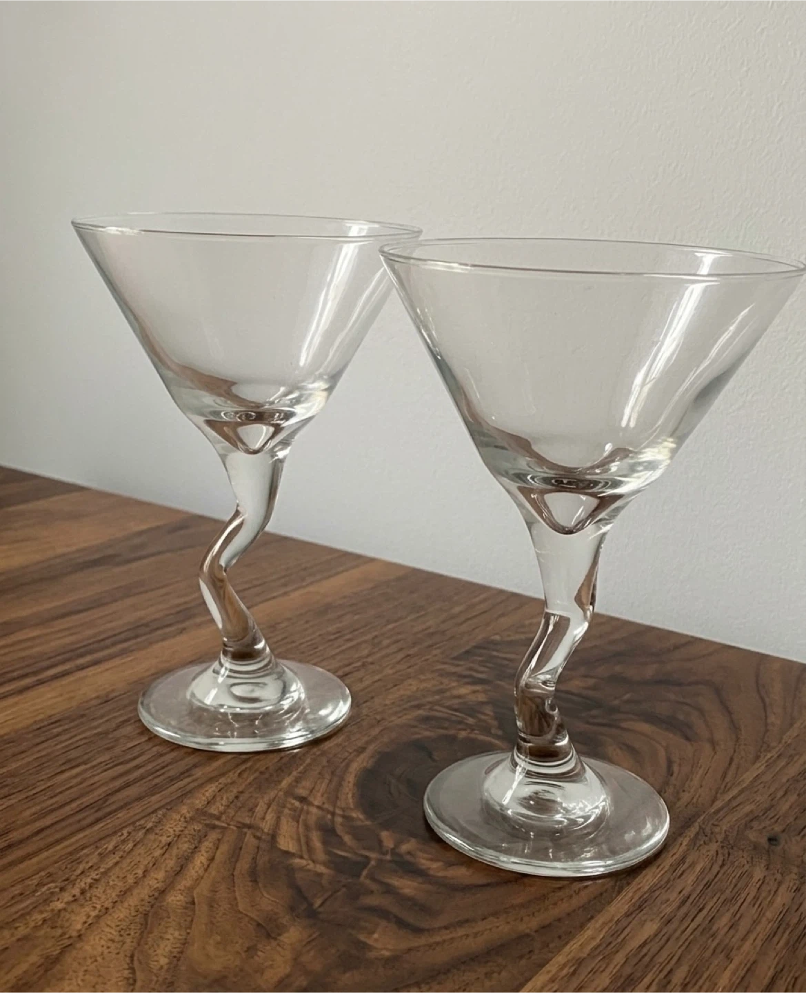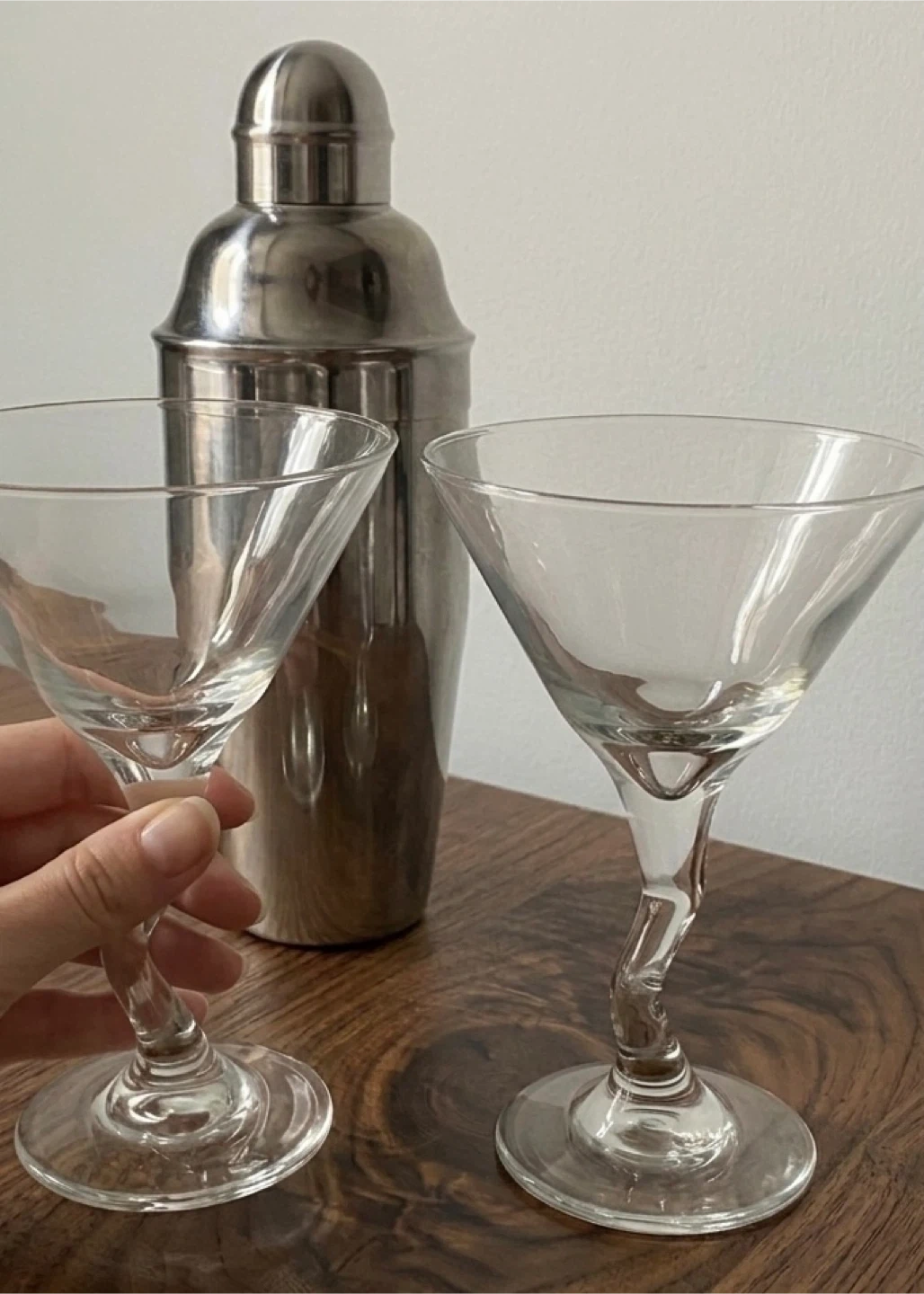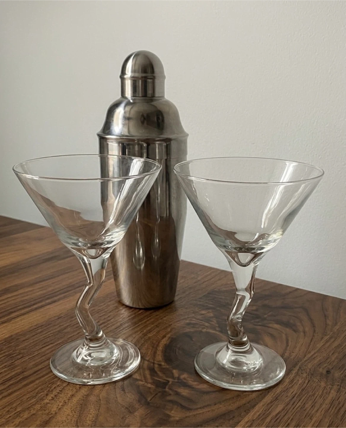 Cool martini set for entertaining! Comes with two heavy vintage martini glasses featuring a unique swirl stem design AND a vintage stainless steel cocktail shaker.