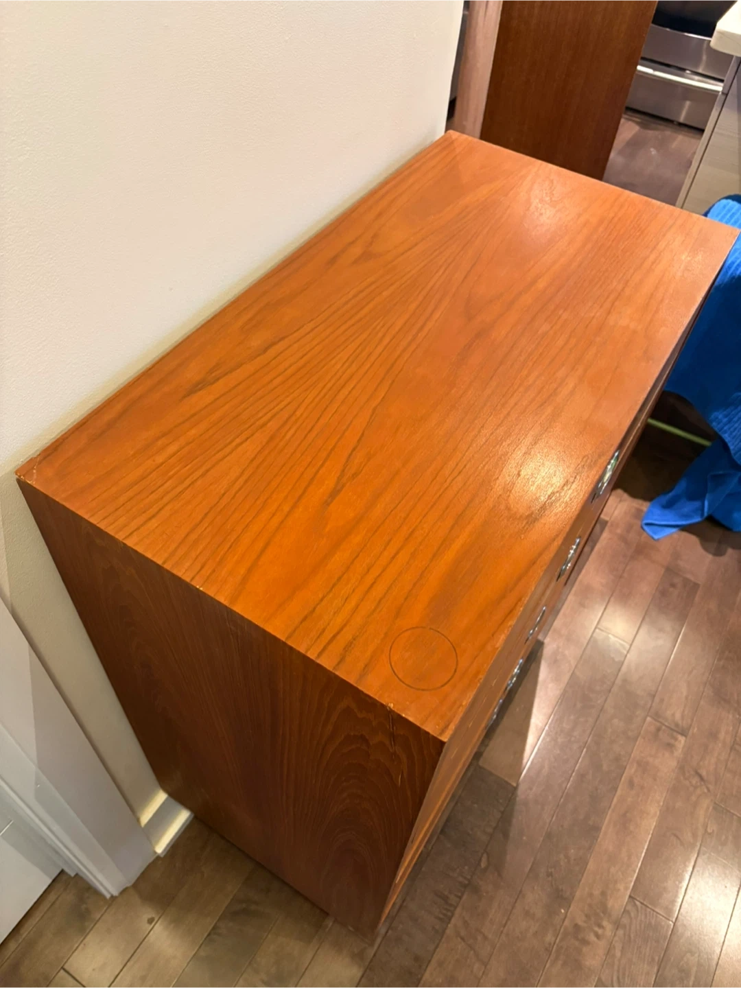 Teak dresser with a simple, clean design. Five drawers that offer ample storage without taking up a lot of space. Shows some age appropriate wear and tear, but overall in good vintage condition. Sturdy and well cared for—great for a bedroom, hallway, or office.