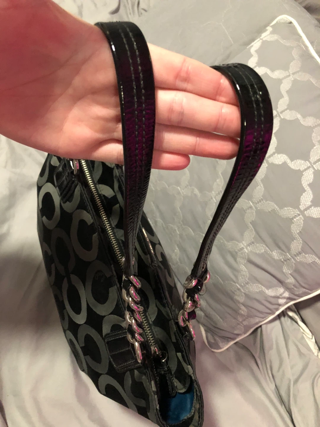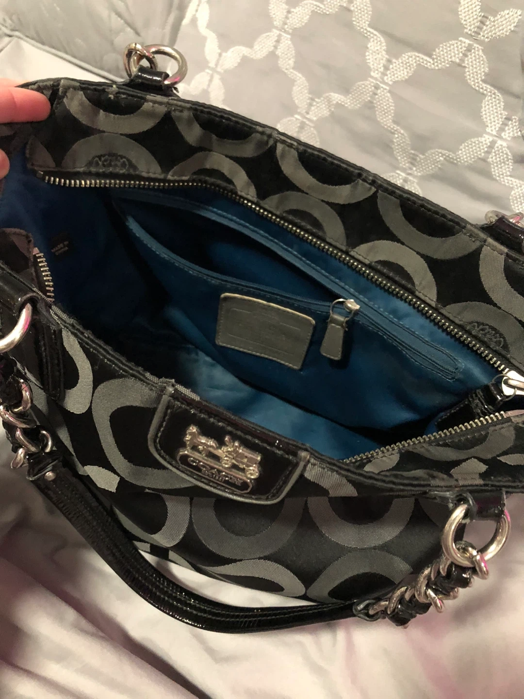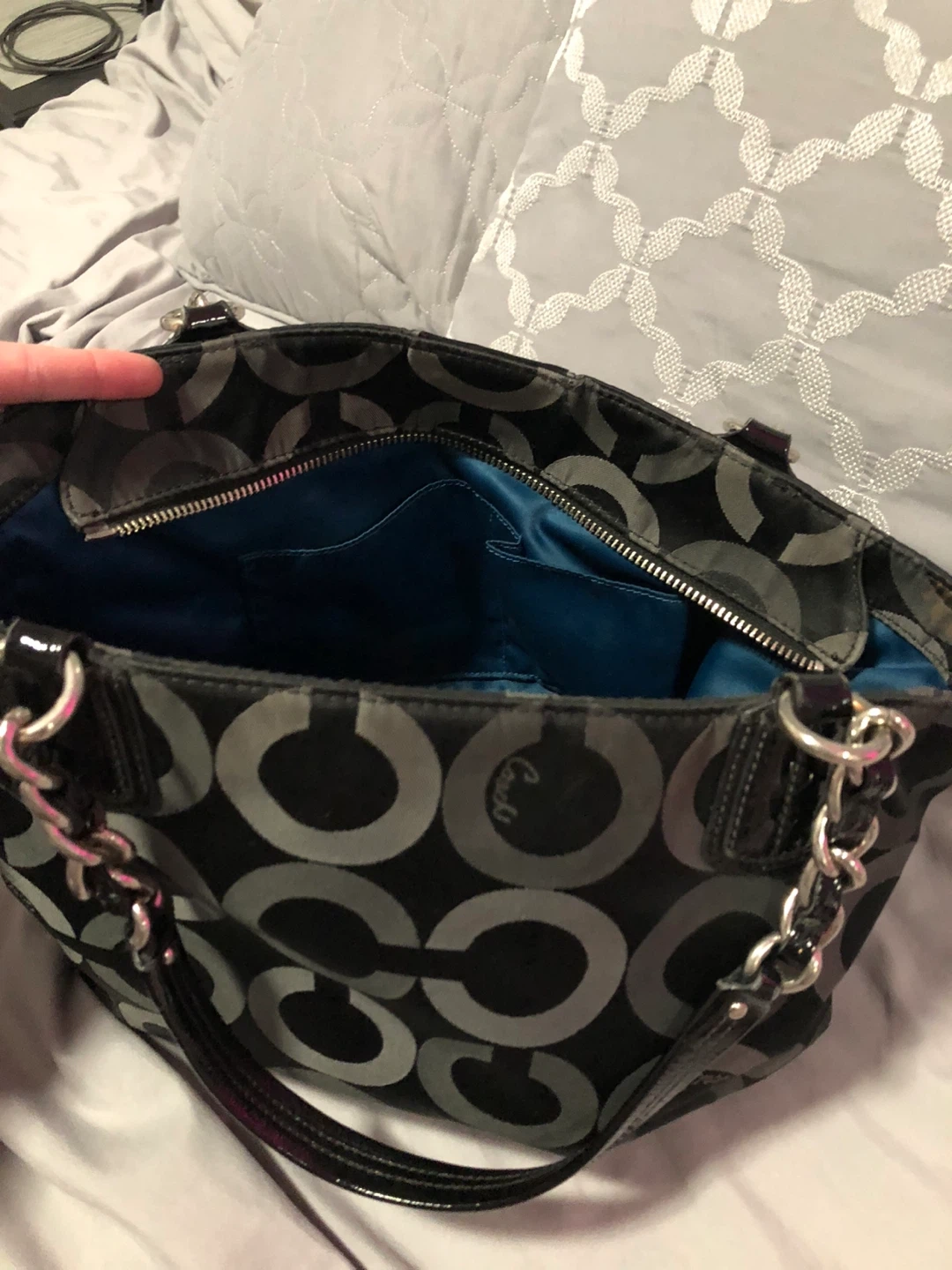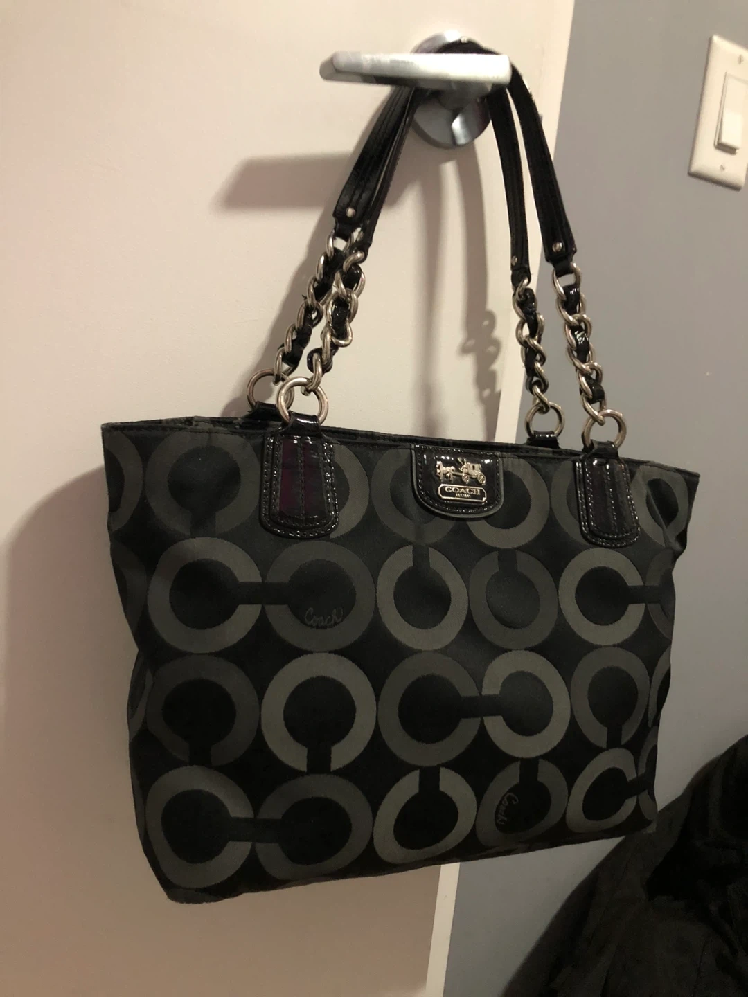 This is a stylish Coach tote bag in black with the signature pattern. It features patent leather accents and silver chain detailing on the straps. The interior is spacious for everyday essentials.