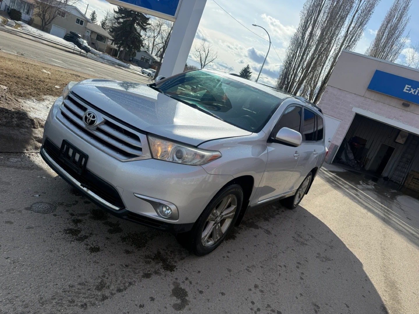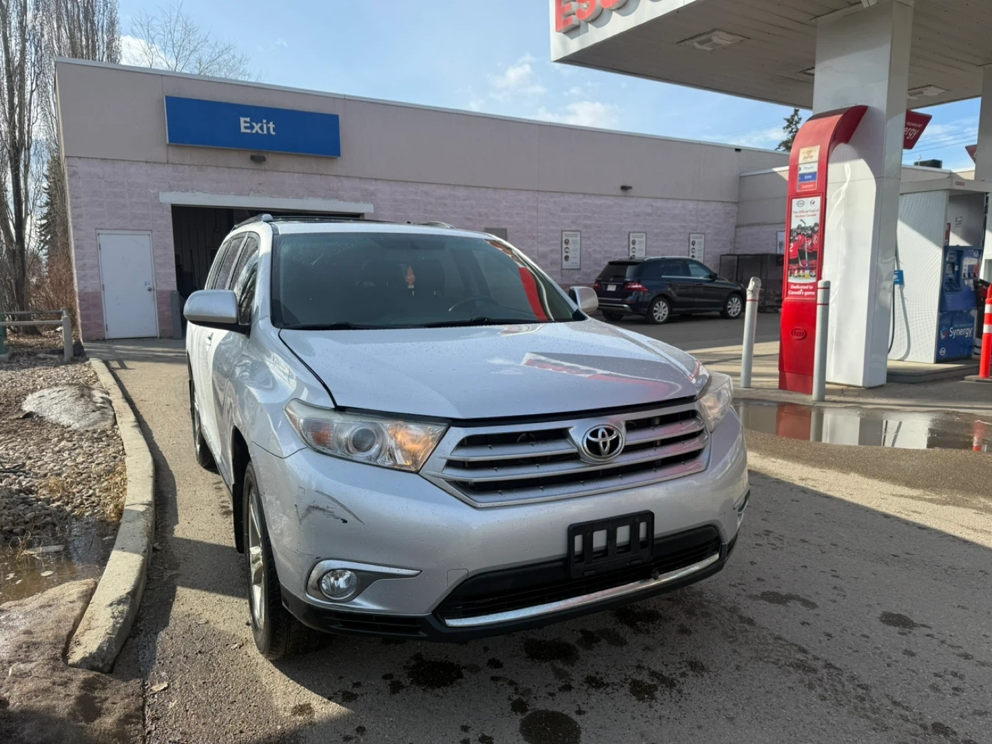 Silver Toyota Highlander SUV. It's a four-door vehicle with tinted windows and a roof rack. Excellent for family trips or daily commuting.
