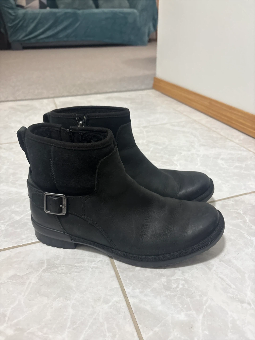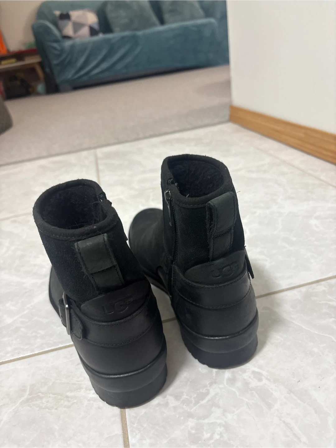 These UGG ankle boots are black with a buckle detail. They're made from leather with a cozy lining. Perfect for keeping your feet warm and stylish! Size 7.5 pick up cash only