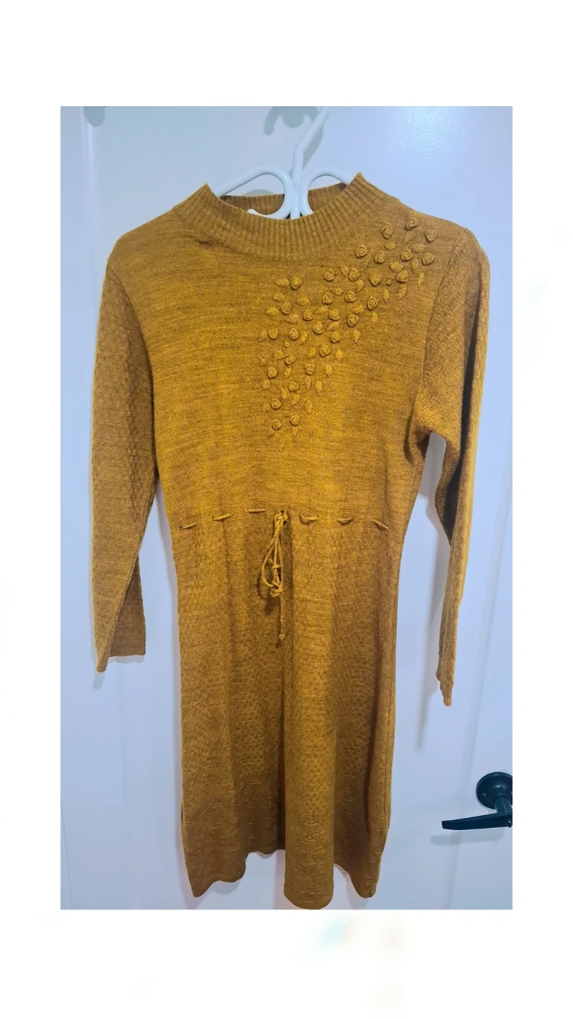 This mustard yellow sweater dress features a cozy knit and a decorative floral detail on the shoulder. It has a cinched waist with a drawstring for a flattering silhouette. The textured sleeves add a touch of interest.