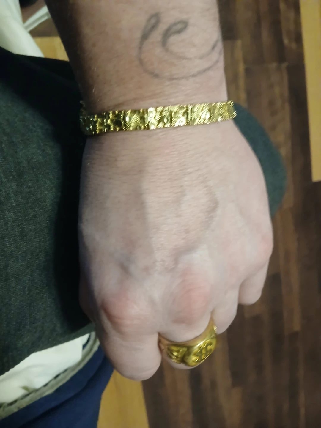 This textured bracelet has a link design and a gold-tone finish. It weighs 14.3 grams. This would be a nice addition to a jewellery collection. Cell # 604*349*6392