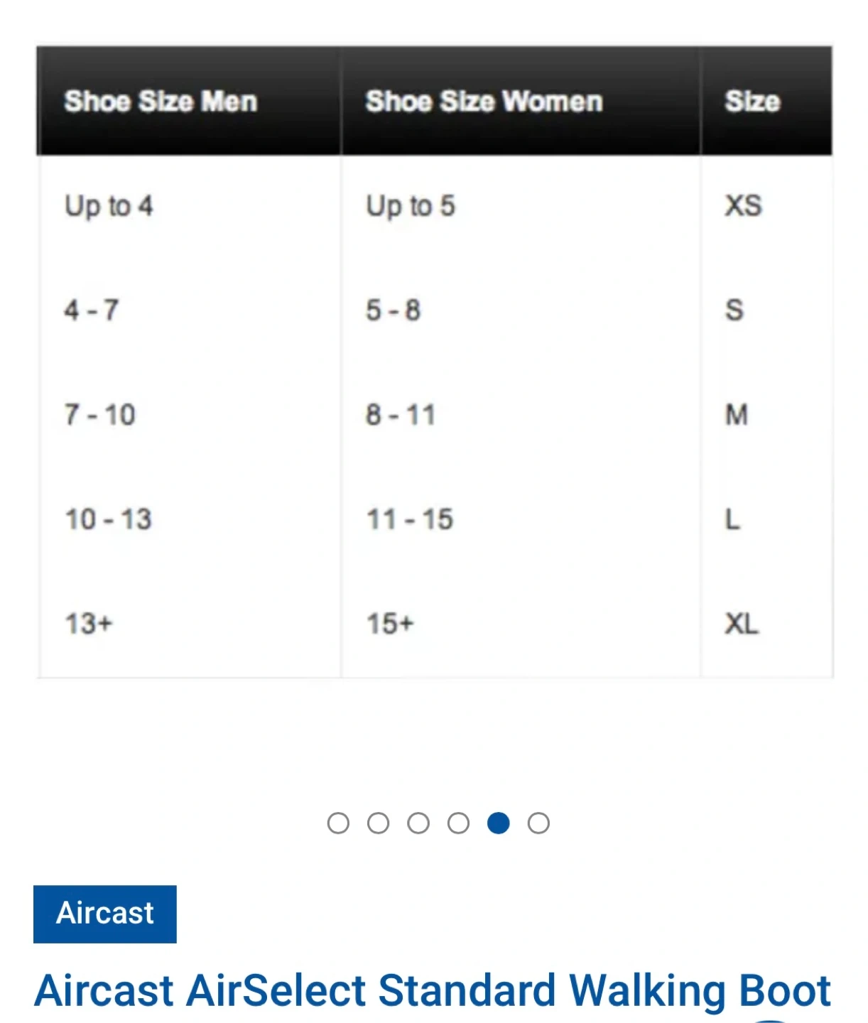 A size small of an AirCast walker boot is appropriate for shoe sizes 4-7 (men’s) or 5-8 (women’s).