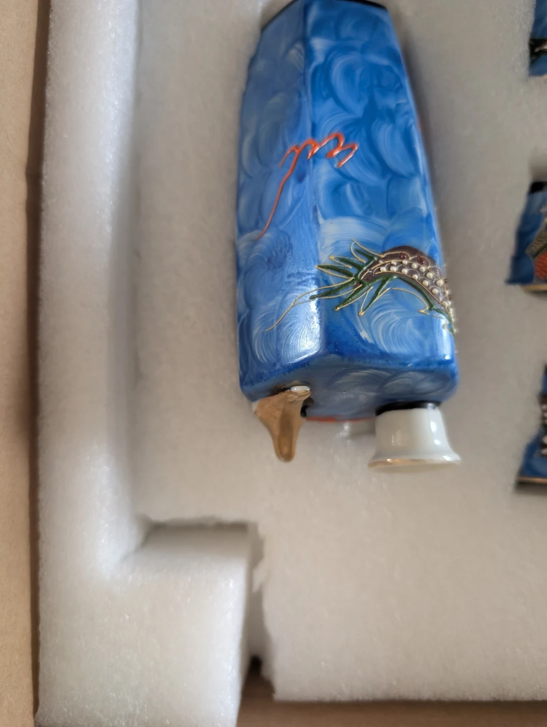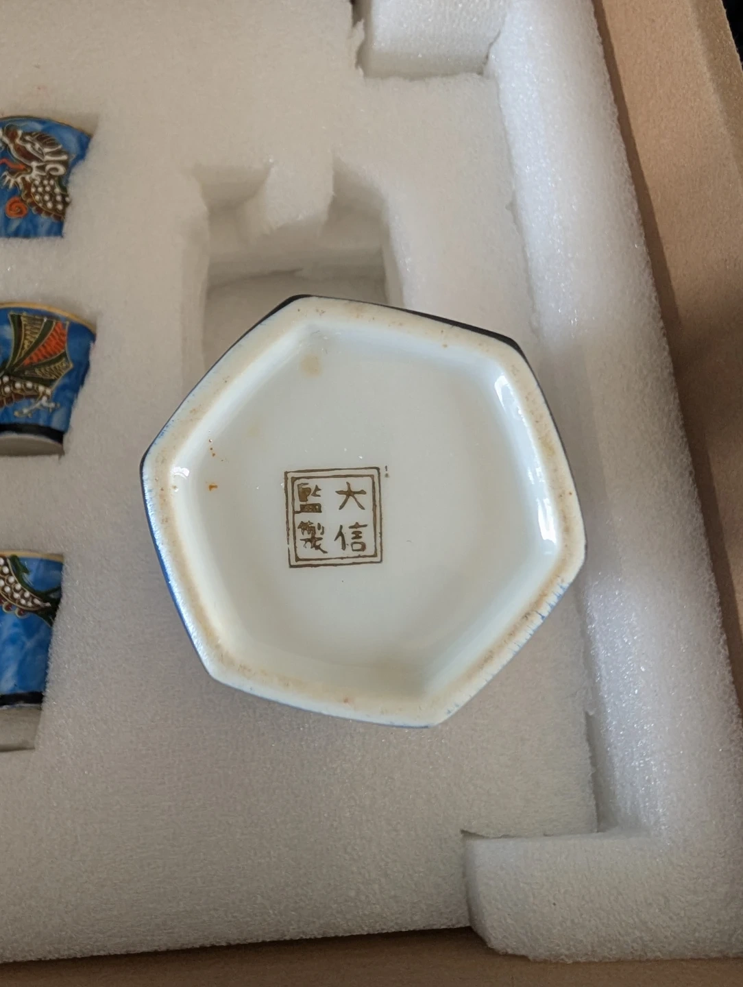 Selling a decorative samurai saki set featuring a blue glaze with a dragon motif. Includes one carafe and six small cups. This set is quite striking!circle 1930 smuggled from France during WW2 from my mother,serving plate was made in 1960 as original one broke