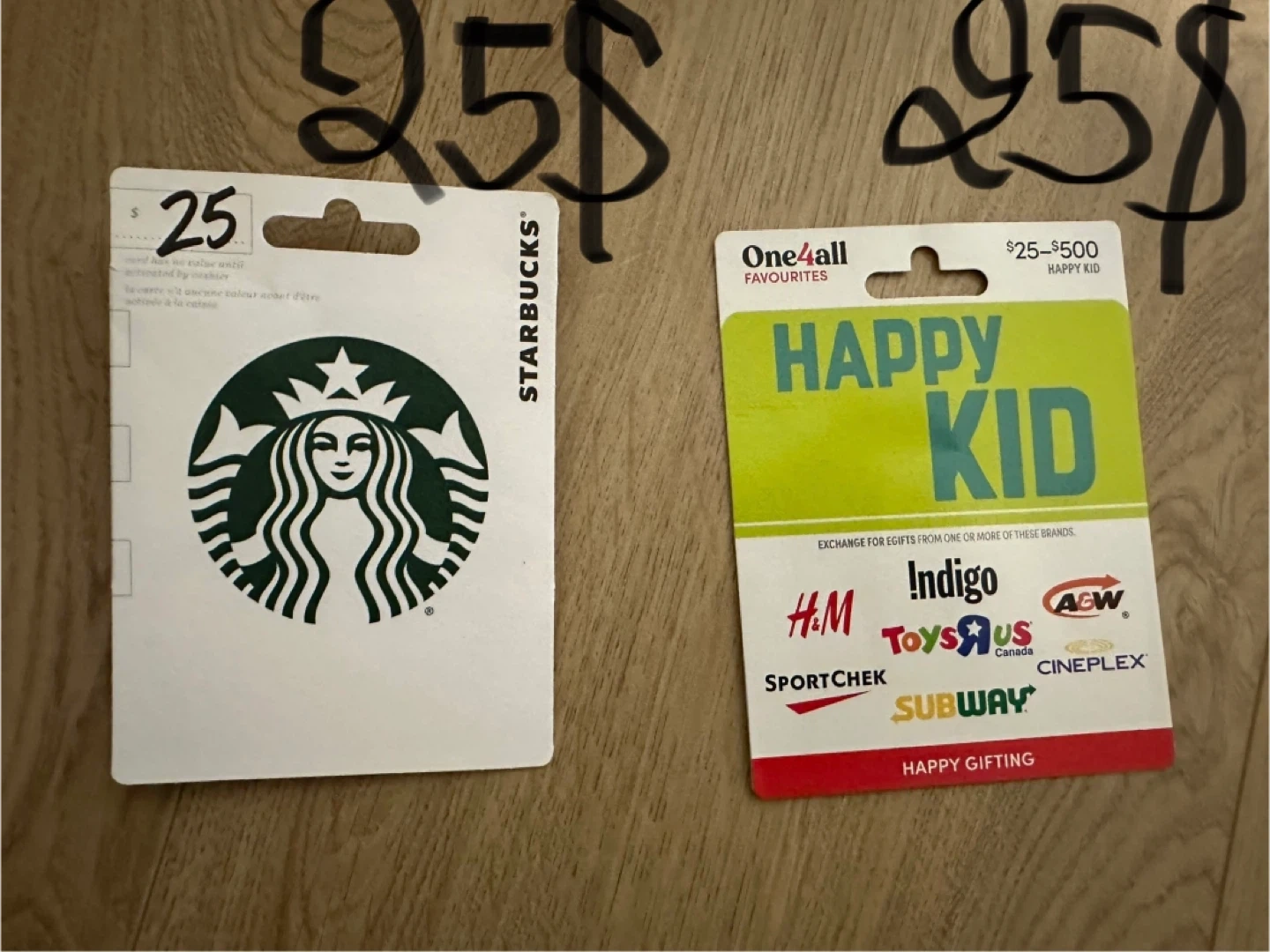 2- ONE4ALL GIFT CARD 25$ ( Indigo, A&W , Toys R us, Cineplex, H&M, SportCheck, Subway)