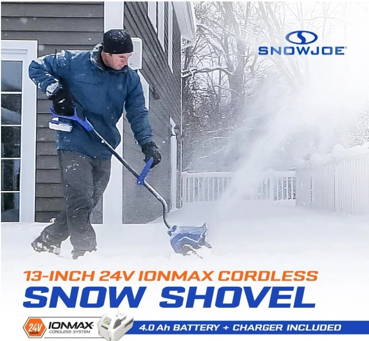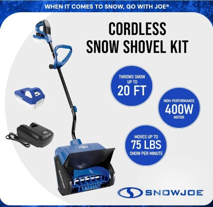 This is a new Snow Joe 24V Cordless Electric Shovel Kit, perfect for clearing snow from your deck, patio, or driveway. It features a 13" clearing width and a 400W motor. The 2-blade auger clears a 13" wide, 6" deep path, throwing snow up to 20 feet. It's powered by a 24V 4Ah battery, clearing up to 300 pounds of snow per minute without gas or oil. Weighing only 17.2 lbs with an ergonomic dual-handle design, it's easy to maneuver and store. The kit includes the shovel, a 4Ah battery, and a quick charger. It's built with rugged materials for durability. Let me know if you're interested!