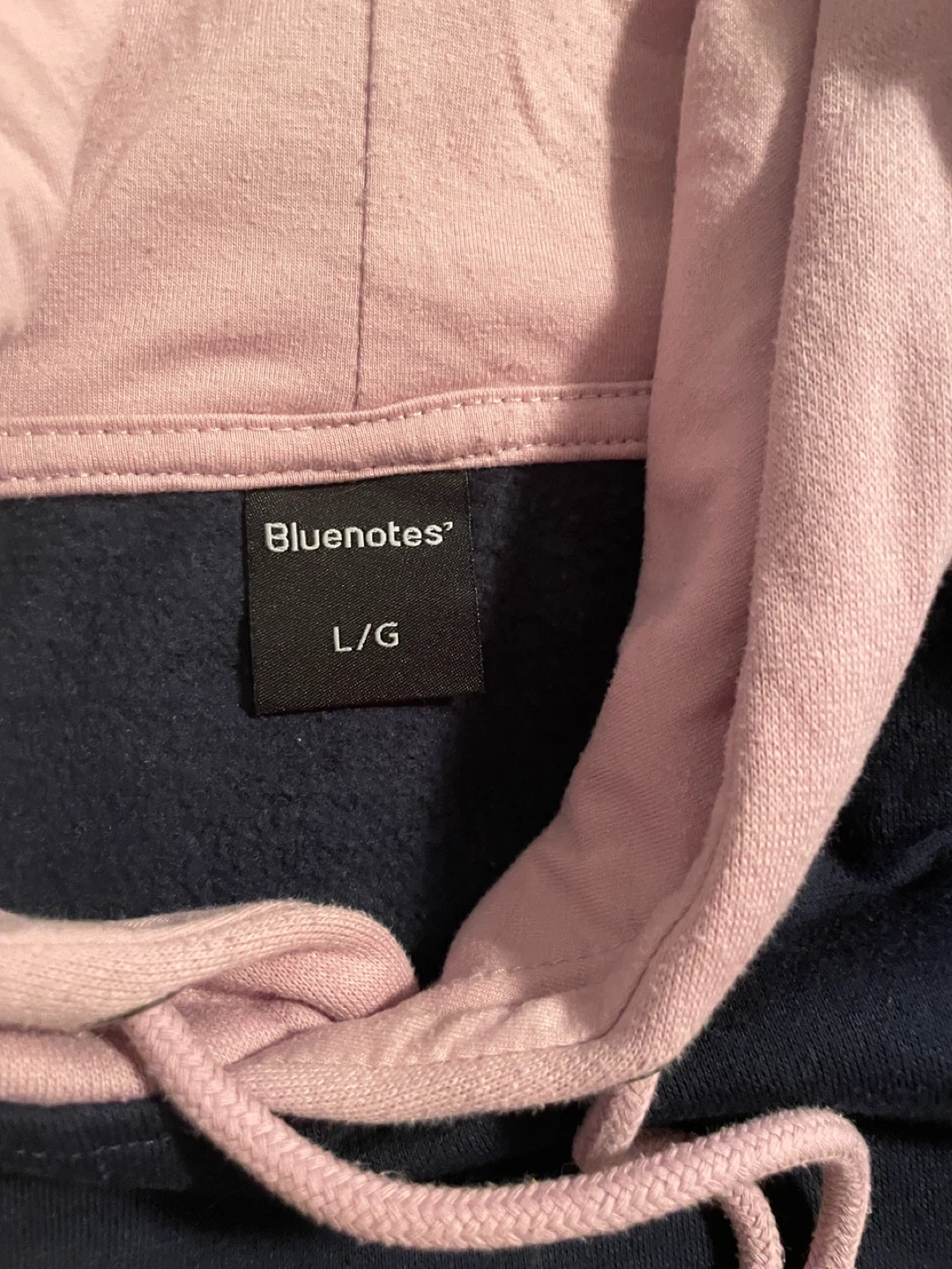 Cozy Bluenotes hoodie in a cool colour block design! This hoodie is size L/G and features a mix of navy, pink, blue, and white. Perfect for staying warm and stylish.
