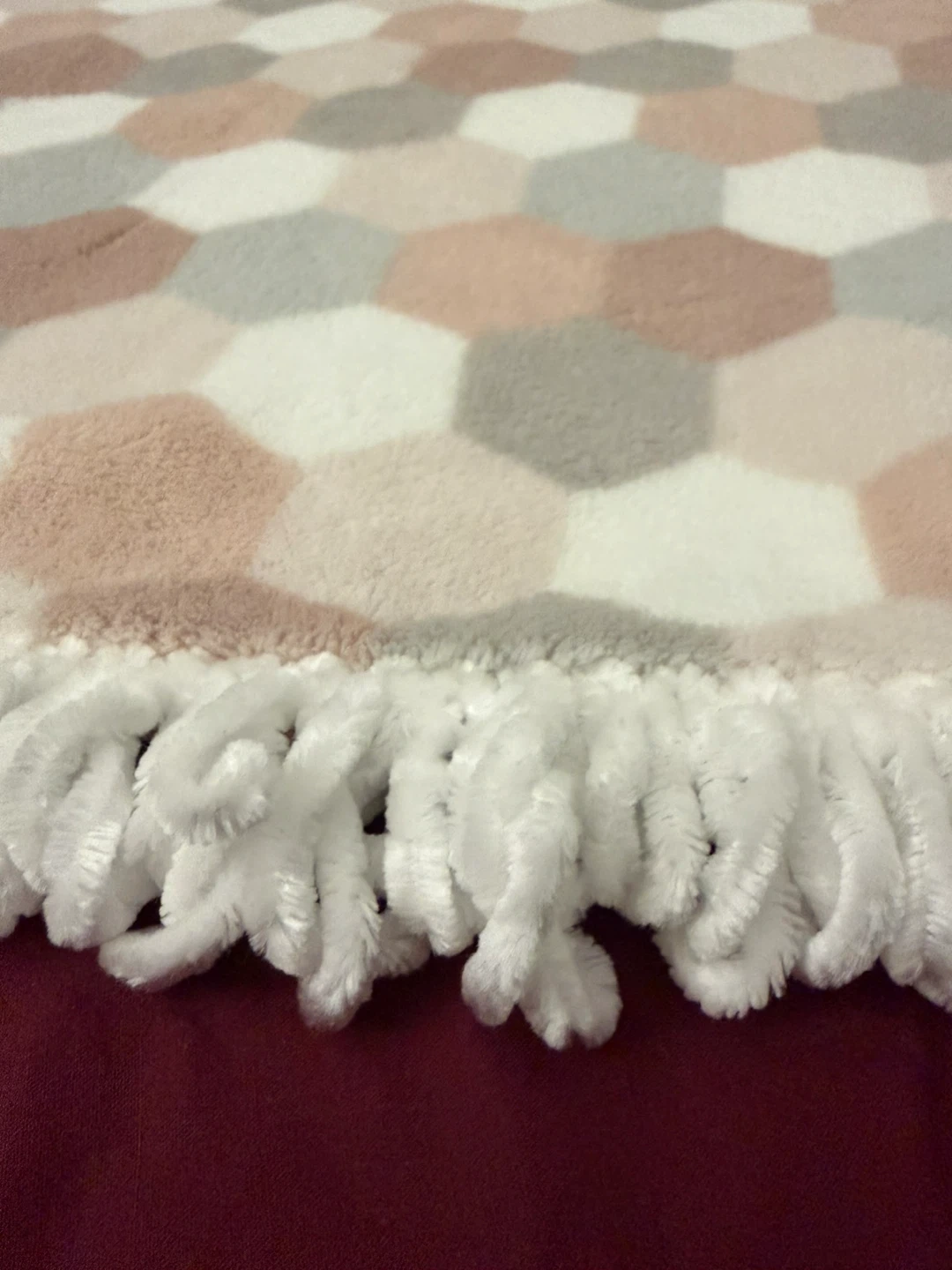 This super soft fuzzy throw blanket features a modern hexagon pattern in shades of pink, gray, and white. It's finished with a white fringe trim. It's perfect for adding a cozy touch to your couch or bed!