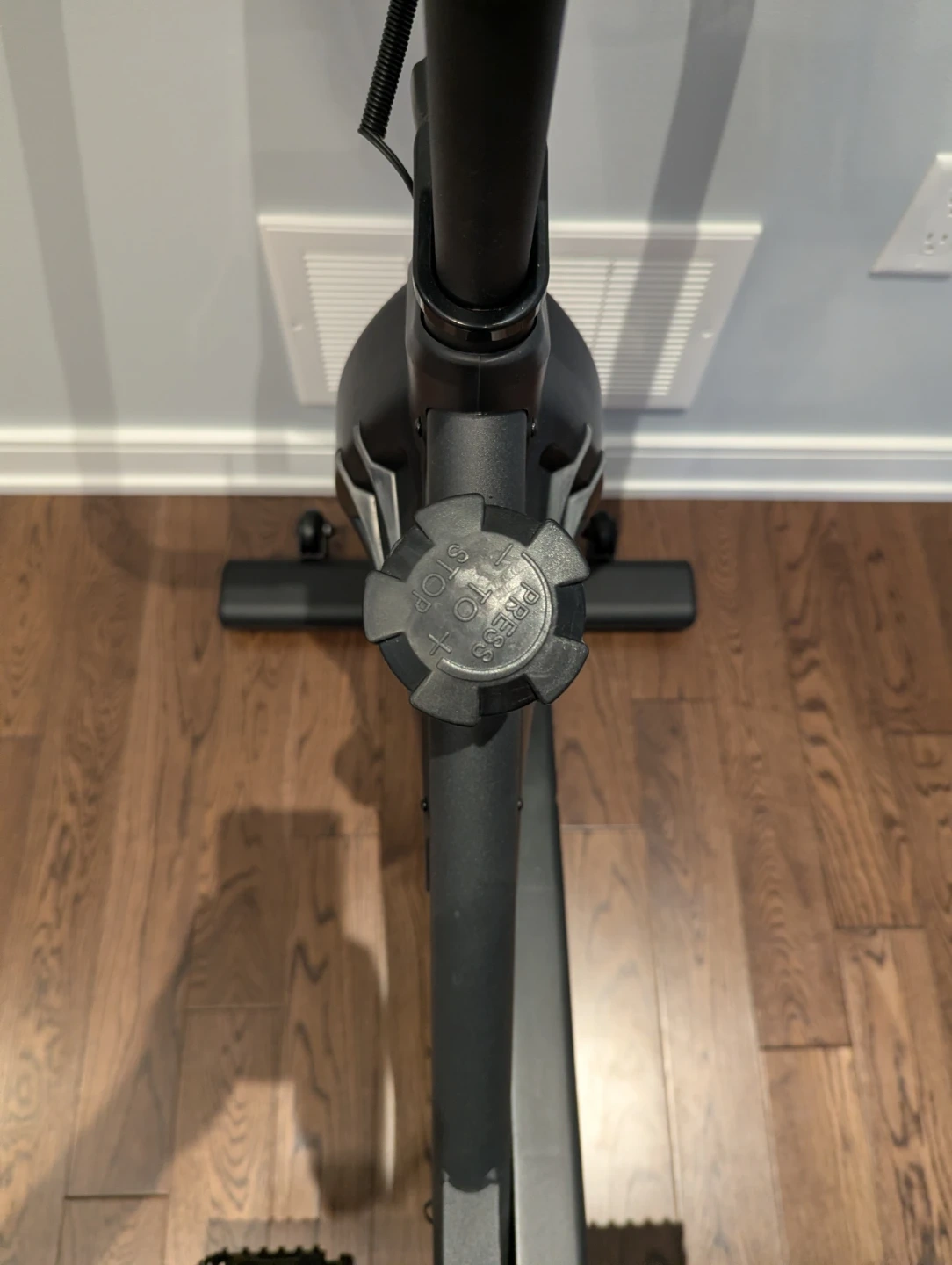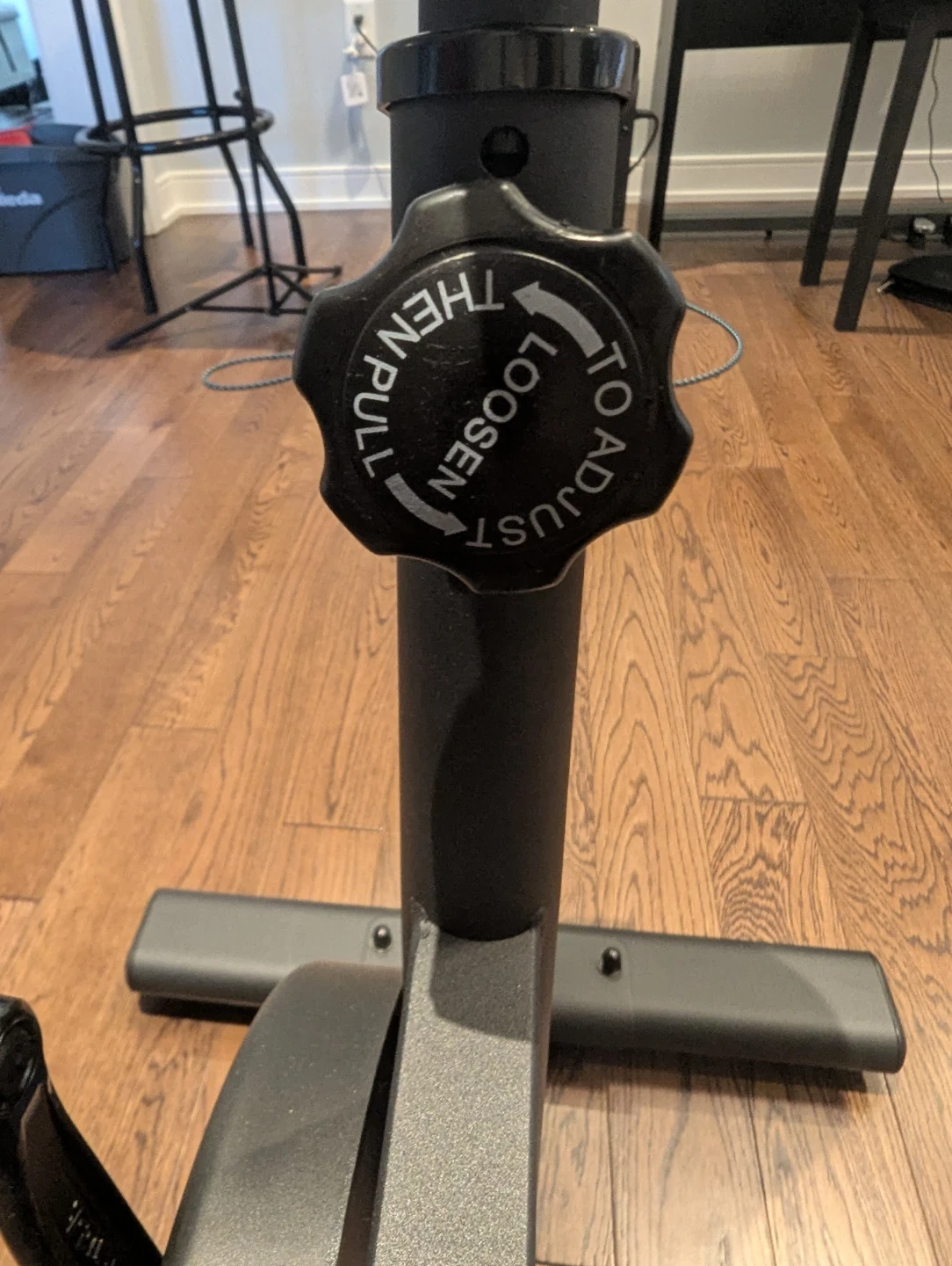 This black exercise bike is great for home workouts. It features a digital display that tracks time, speed, distance, calories, and pulse. Adjustments are easy with the twist knobs for resistance and seat height. It's built with a sturdy frame and wheels for easy movement. This bike is suitable for anyone looking to get in shape at home!