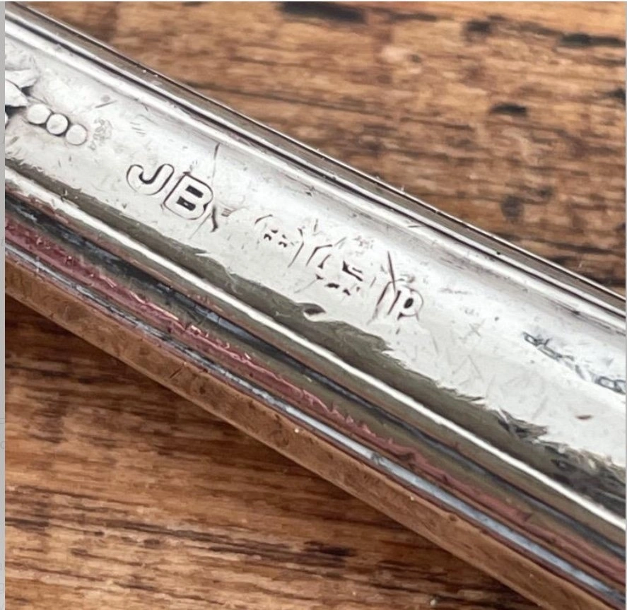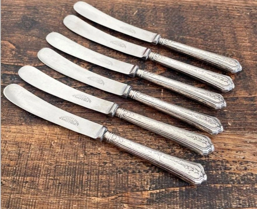 Add a touch of Art Deco elegance to your table with this set of six dessert knives, crafted by the renowned John Biggin. Origin: Sheffield, England (Dated 1932). Material: Sterling Silver handles (Lion Passant hallmarked) with silver-plated blades. Maker: John Biggin (JB Maker's Mark). Dimensions: 169mm (approx. 6.6 inches). Condition: Authentic vintage "used" condition. Handles show light, honest dings—characteristic of a set enjoyed for nearly a century. Price: $200 (Firm).
