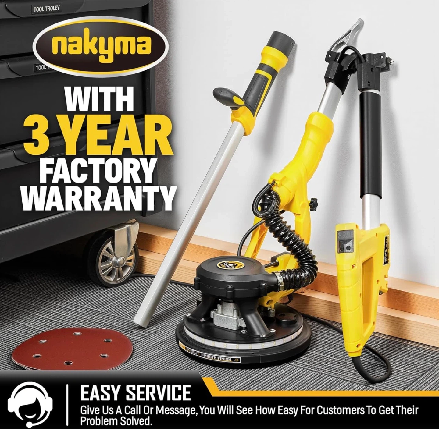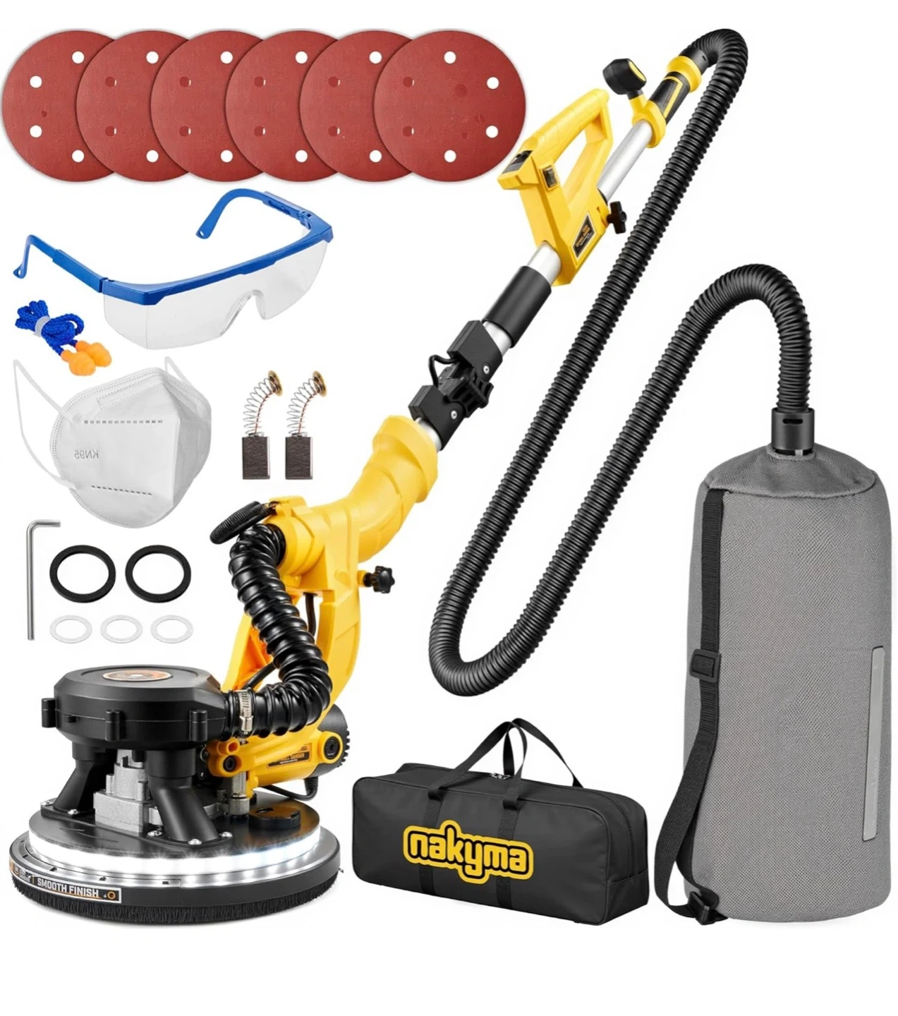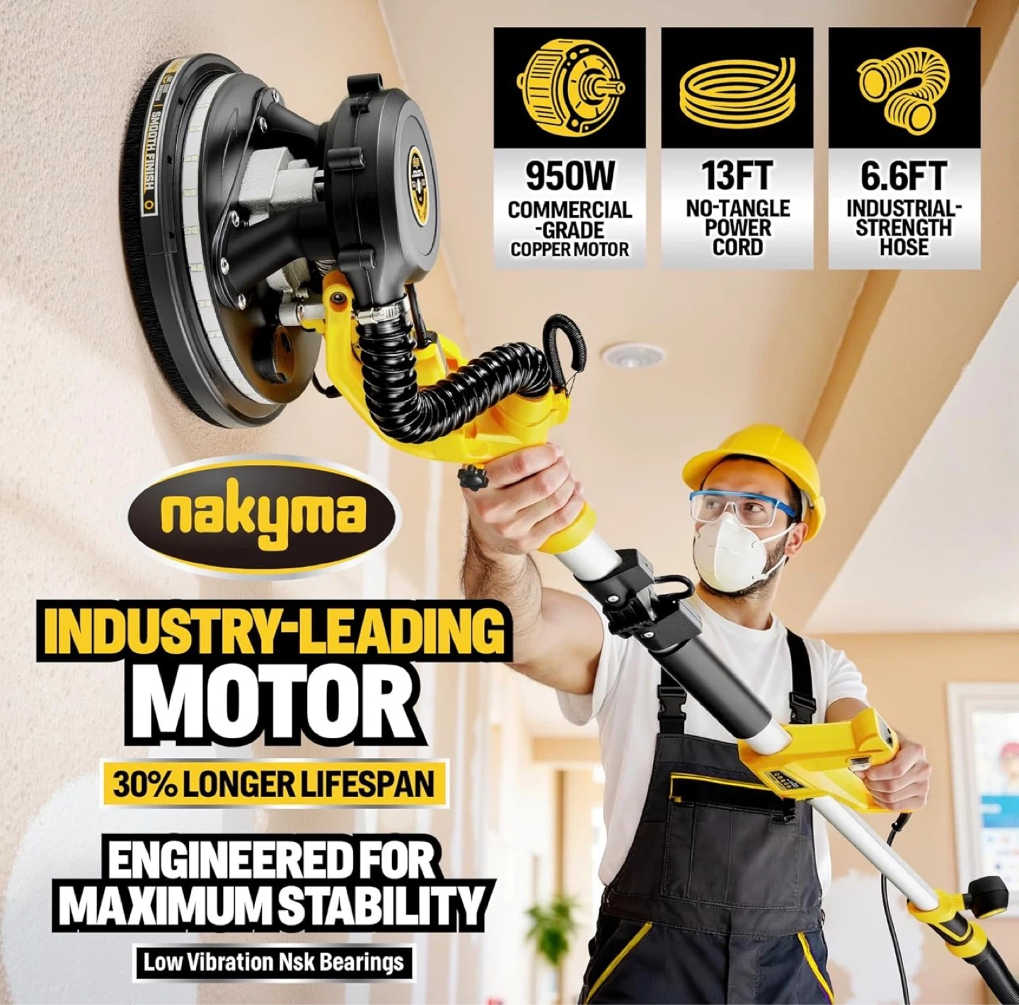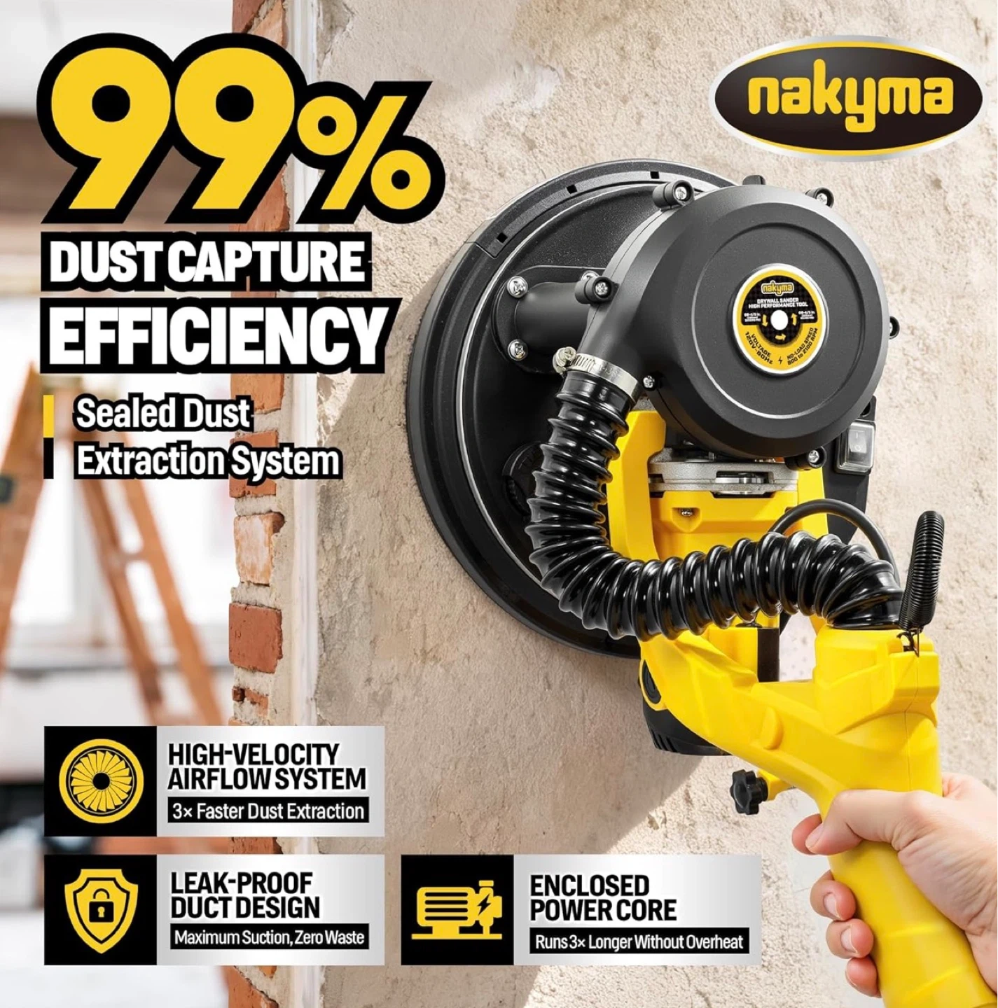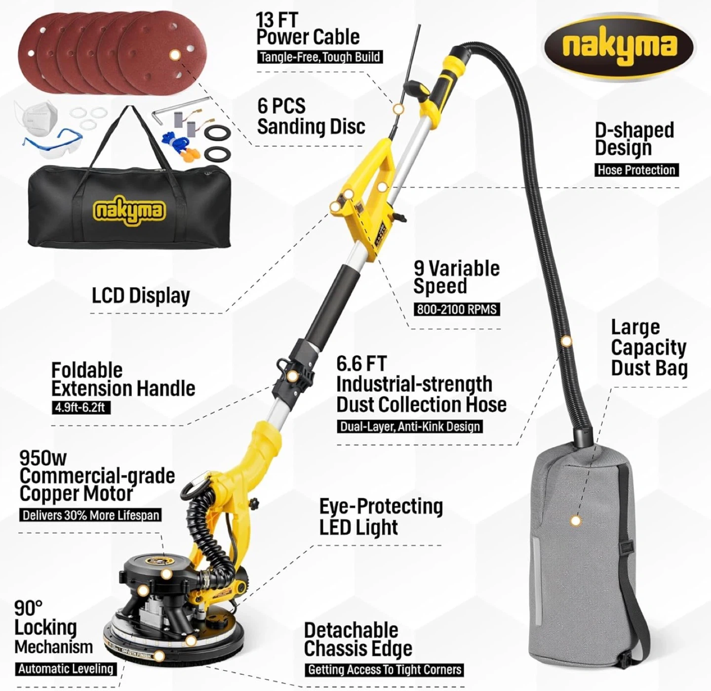 950W Electric Drywall Sander features a patented 99% automatic dust removal system, keeping your air clean and your workspace tidy. Powered by a high-performance 8.5A pure copper motor, it offers 9 variable speed settings (800-2100 RPM) to handle everything from delicate drywall to tough popcorn ceilings.