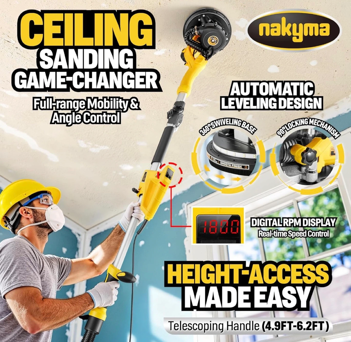 Reach New Heights: The telescoping handle extends from 4.6ft to 6.3ft, allowing you to sand 12ft ceilings without a ladder.