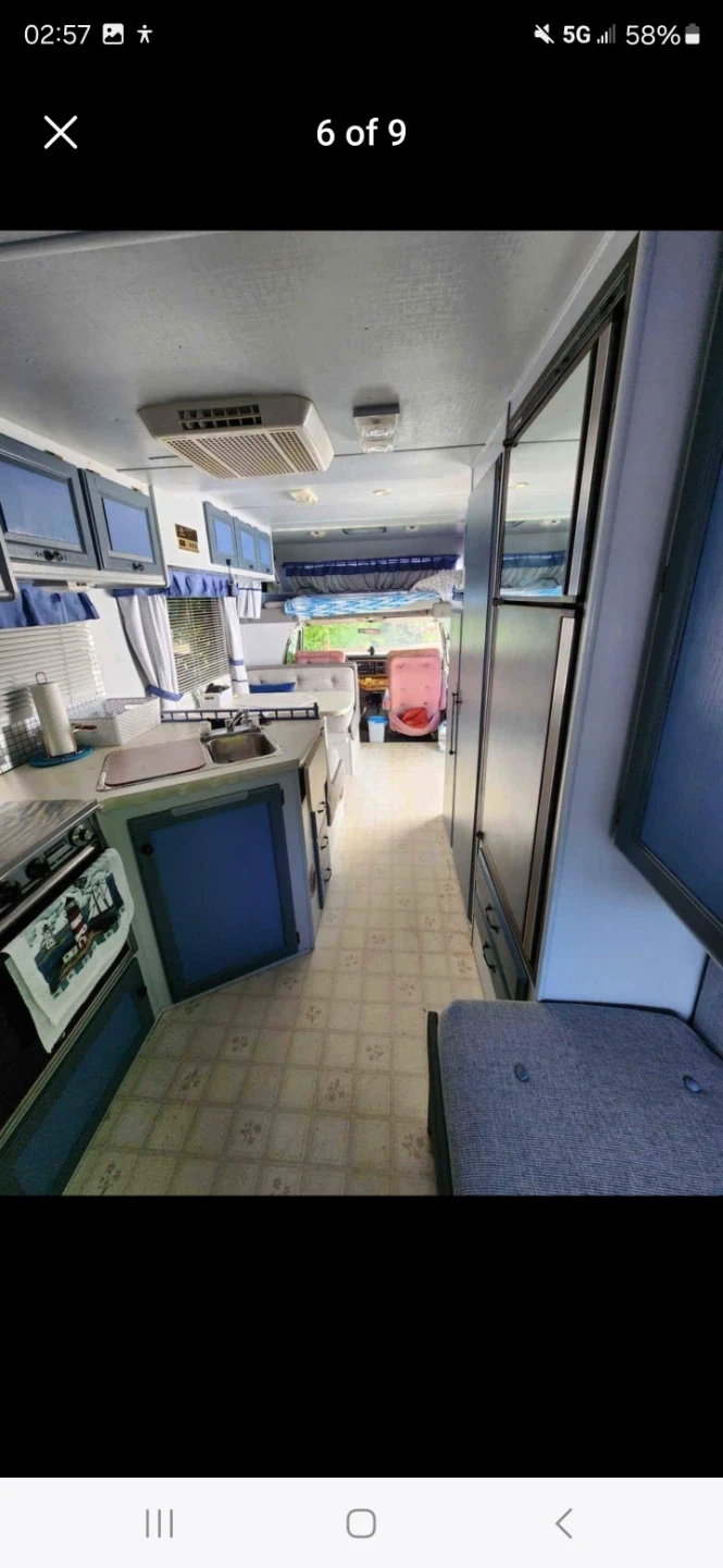This Class C RV camper is ready for your next adventure! It features a dinette area that converts to a bed, and a separate sleeping area. The kitchen includes a sink and stove. Ample storage cabinets throughout. All Propane Equipment work well, Heater, Hot Water, Fridge. Freezer and Oven.