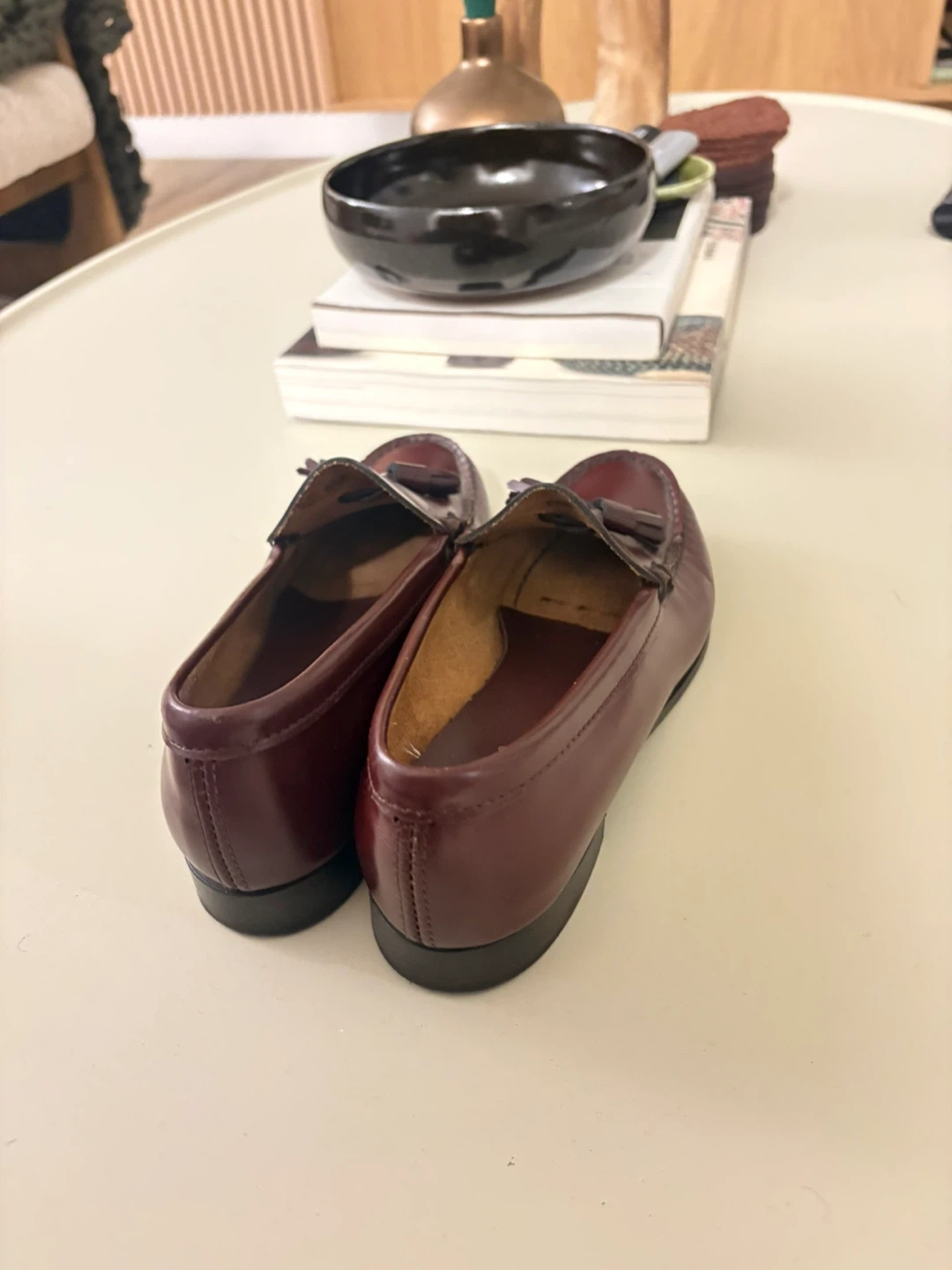 Classic burgundy leather loafers from Weejuns. Features a tassel detail on the vamp. Size is 5.5B. Leather upper and lining.