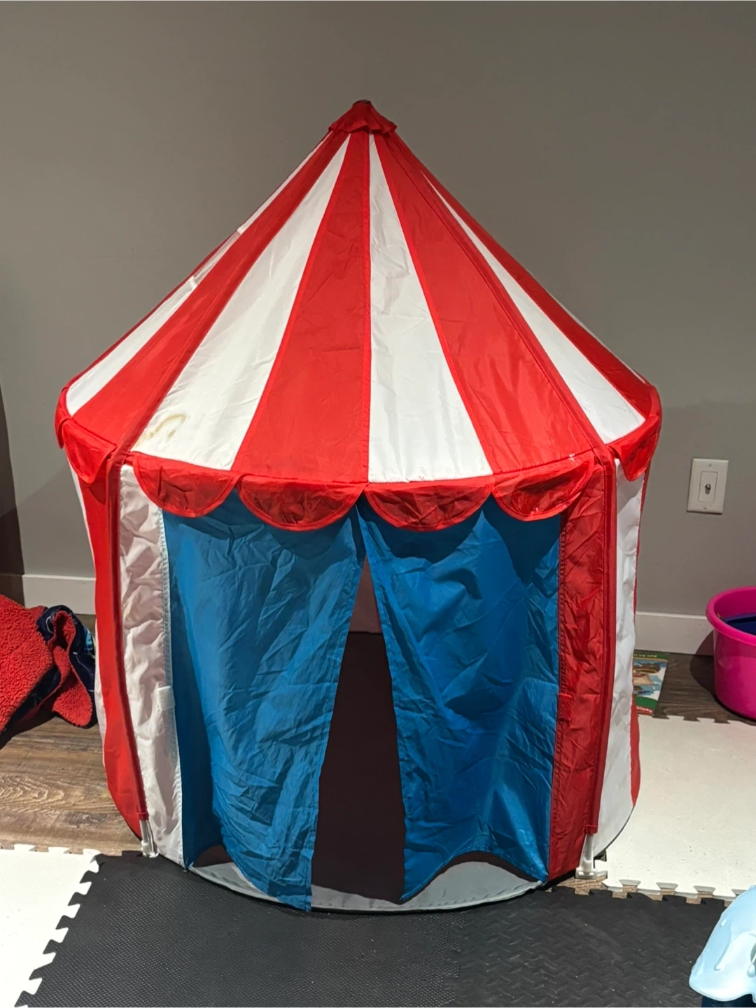 Selling a fun circus tent for kids! It's in great shape and perfect for indoor or outdoor play. Features a red and white striped top with blue curtains for the entrance. Hours of fun await!