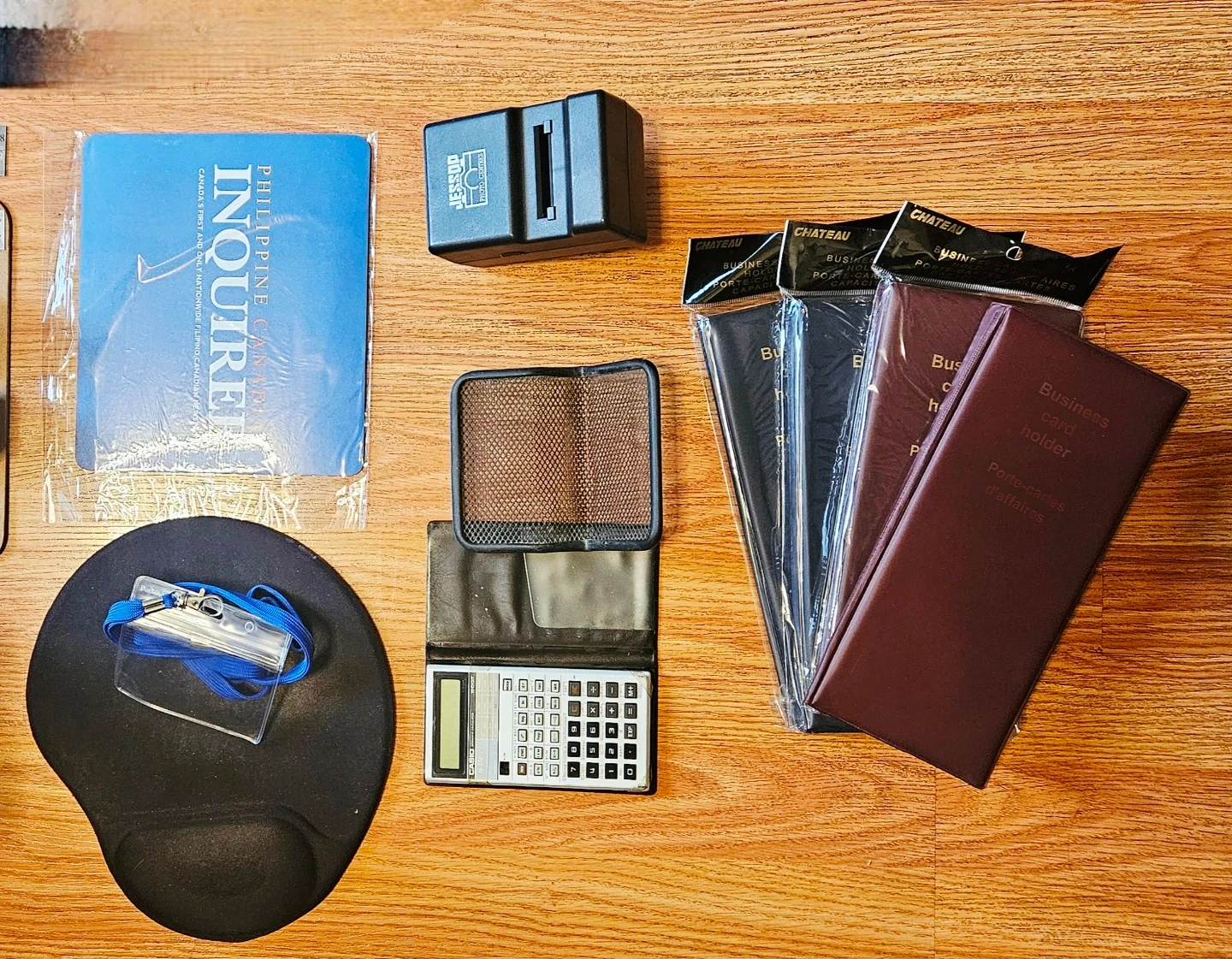 Includes multiple Chateau business card holders in a burgundy and black colour. Also comes with a scientific calculator, mouse pads, a badge holder with a lanyard, and more. Great for organizing contact information!