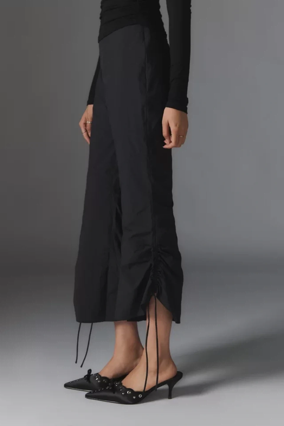 These black cropped pants feature a unique ruched design along the sides with drawstring detailing. They're made from a lightweight material, perfect for warmer weather.