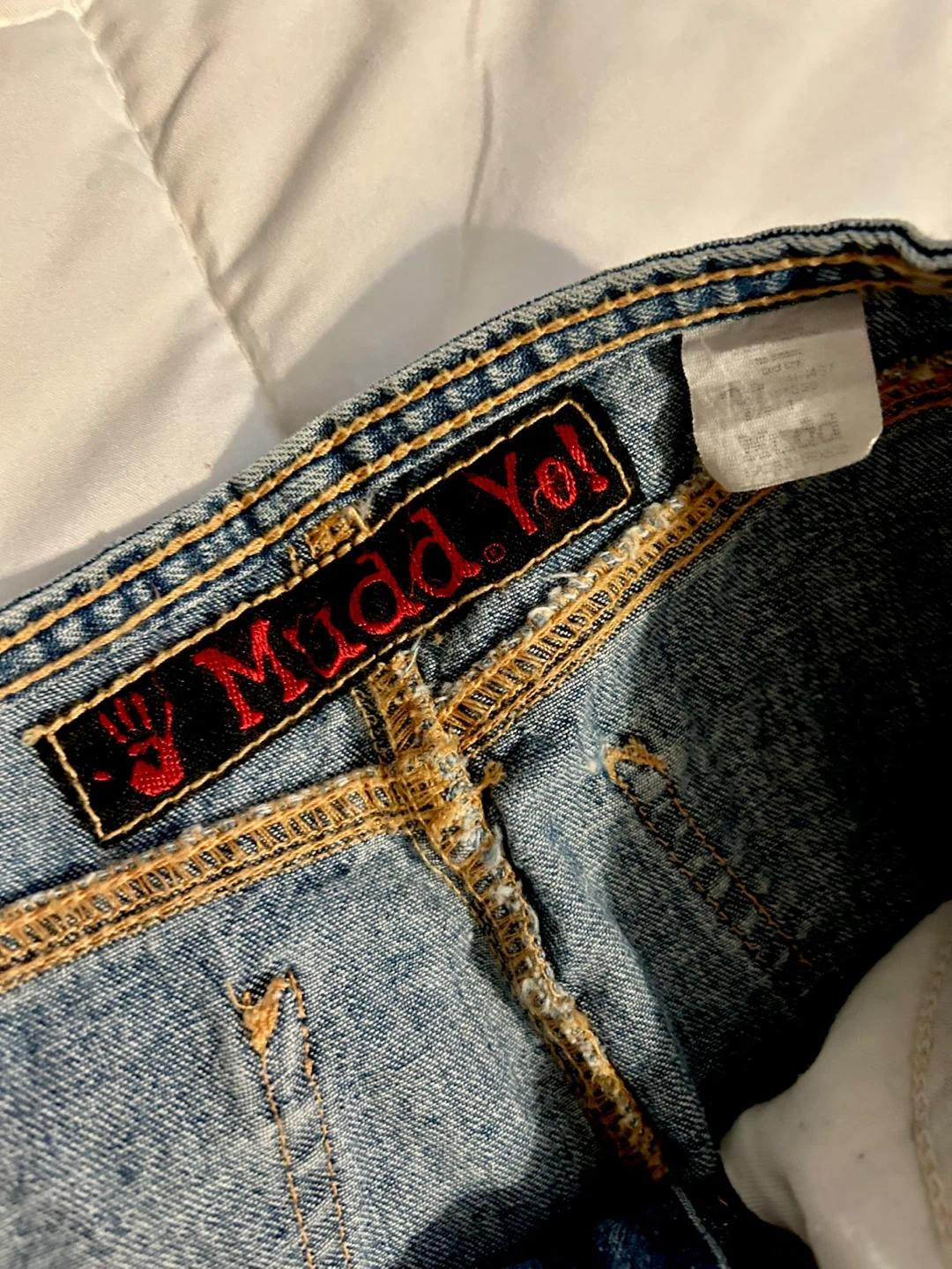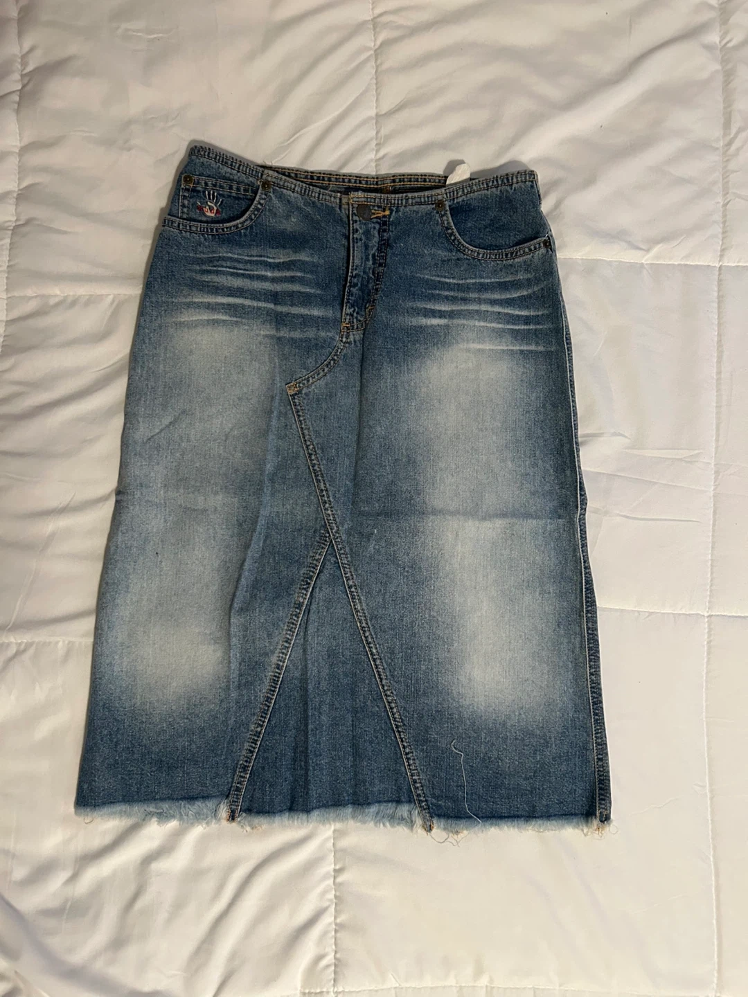 Vintage Y2K Mudd denim midi skirt. Features frayed bottom hem. Vintage size 3. Measurements in photos.