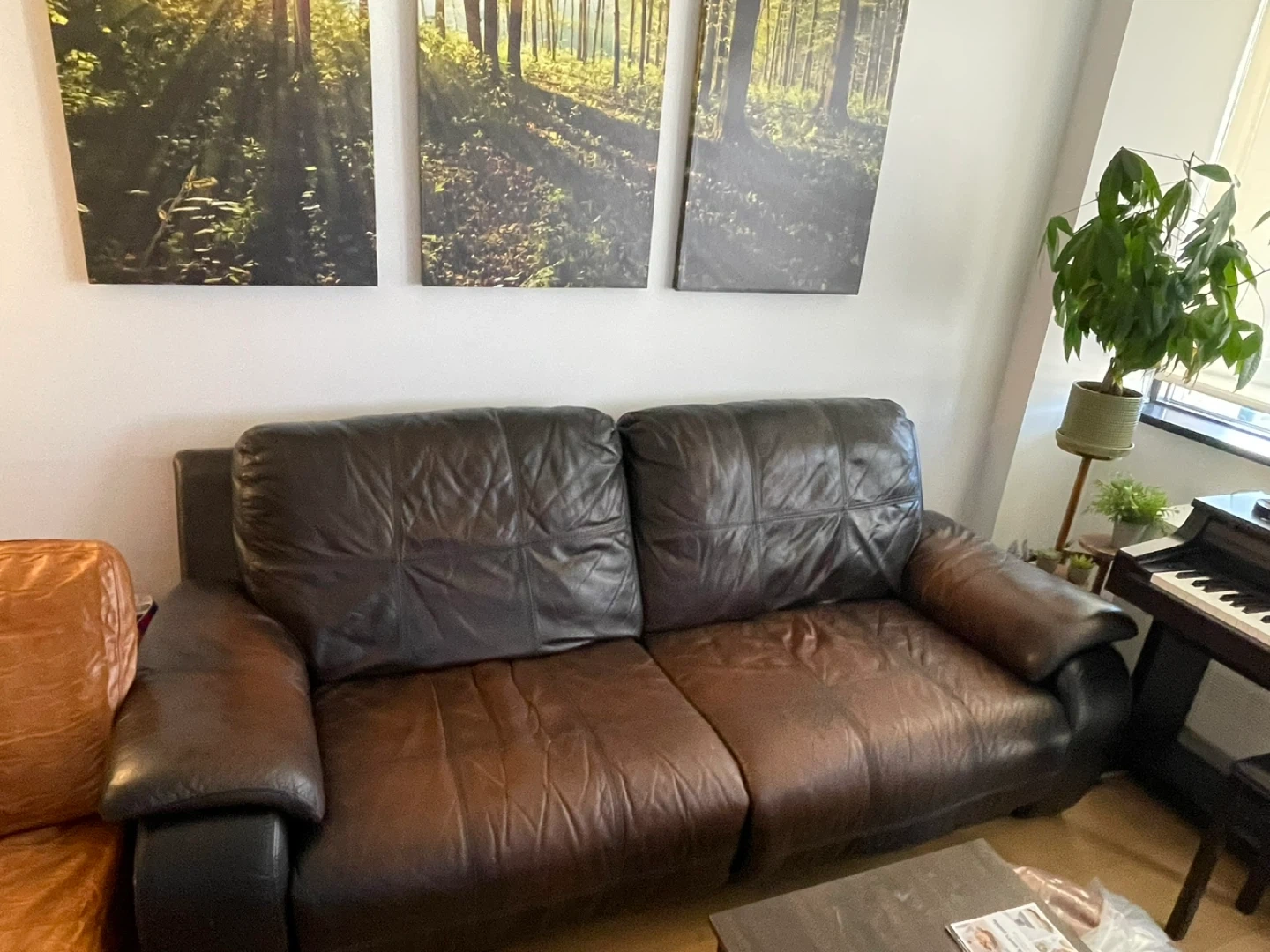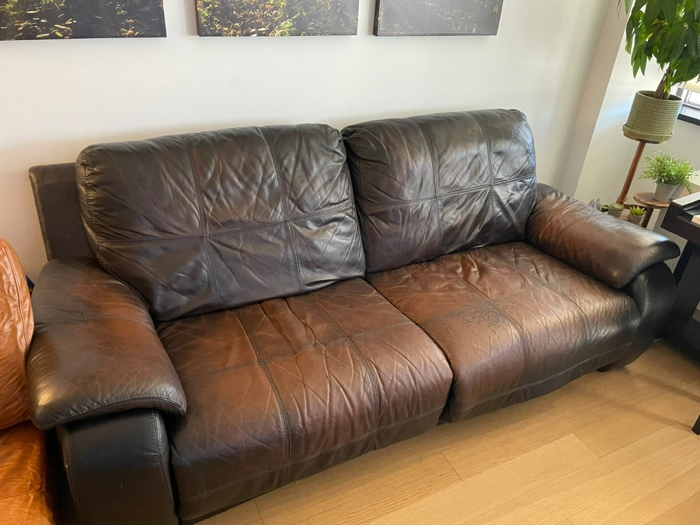 Selling a comfortable two-seat sofa. It's made of brown leather and is perfect for a living room or den. It’s 10 years old with some wear on the seating but is in good condition for sleeping or sitting. It can also extend out a full 180 degrees for sleeping on both sides! $200 OBO.