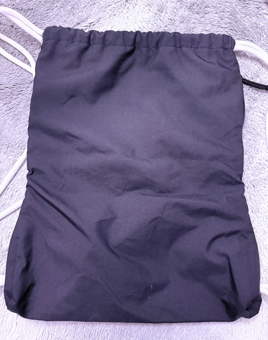 This is a black Nike drawstring bag with a large white Swoosh logo. It's made of durable material and features white drawstrings that double as shoulder straps. It has a zippered pocket on the side for smaller items. Unisex.