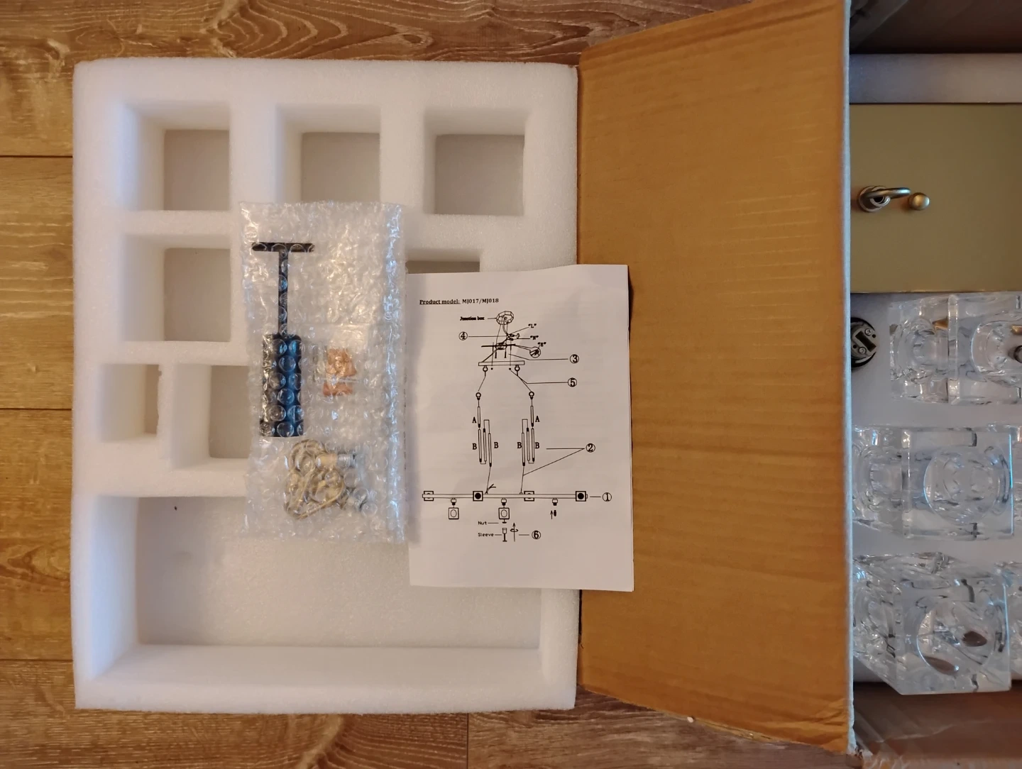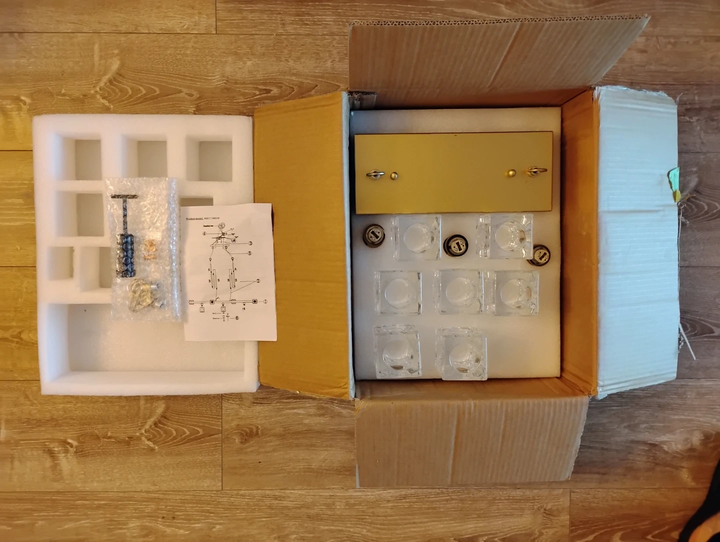 This is a brand new modern chandelier fixture with a brass finish and crystal accents. It includes all necessary components and mounting hardware for installation. A stunning addition to any room, it's perfect for dining areas or entryways.