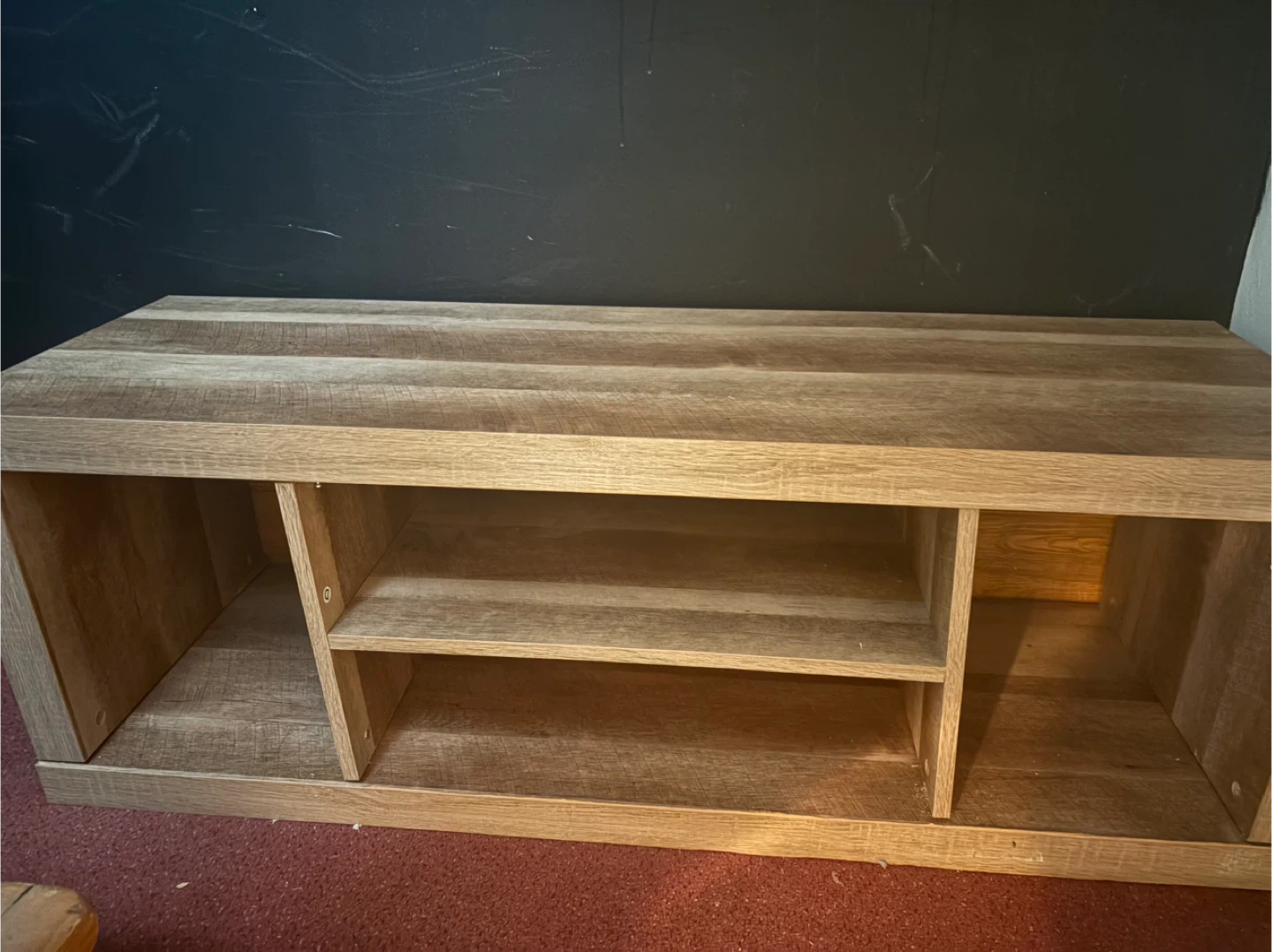 This media console features a wood-grain finish and offers open shelving for your electronics. It's perfect for organizing your living room space! The unit has multiple compartments for storage.