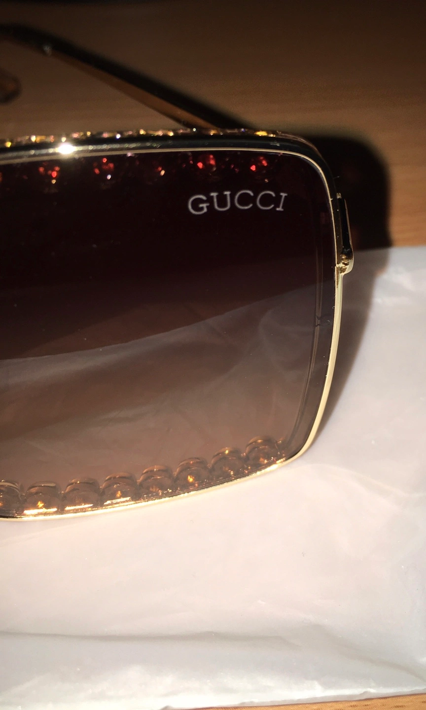 These Gucci sunglasses feature a bold, oversized square frame embellished with sparkling crystals. The gradient brown lenses offer stylish sun protection.